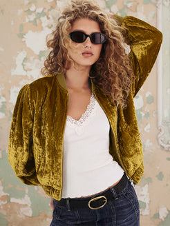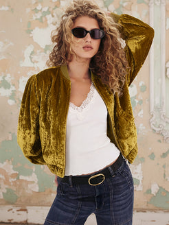 Designed for versatility, this gold velvet baseball jacket can be paired with a variety of looks, from casual to chic. Wear it over a simple white tee and high-waisted jeans for a laid-back yet fashionable daytime outfit, or elevate your style by layering it over a little black dress for an evening out. The unique combination of retro charm and modern flair makes this jacket an eye-catching addition to any wardrobe, ensuring you make a statement wherever you go. Whether you’re heading to a game, a night out with friends, or a casual brunch, the Retro and Fashionable Gold Velvet Baseball Jacket is sure to turn heads and showcase your unique style.