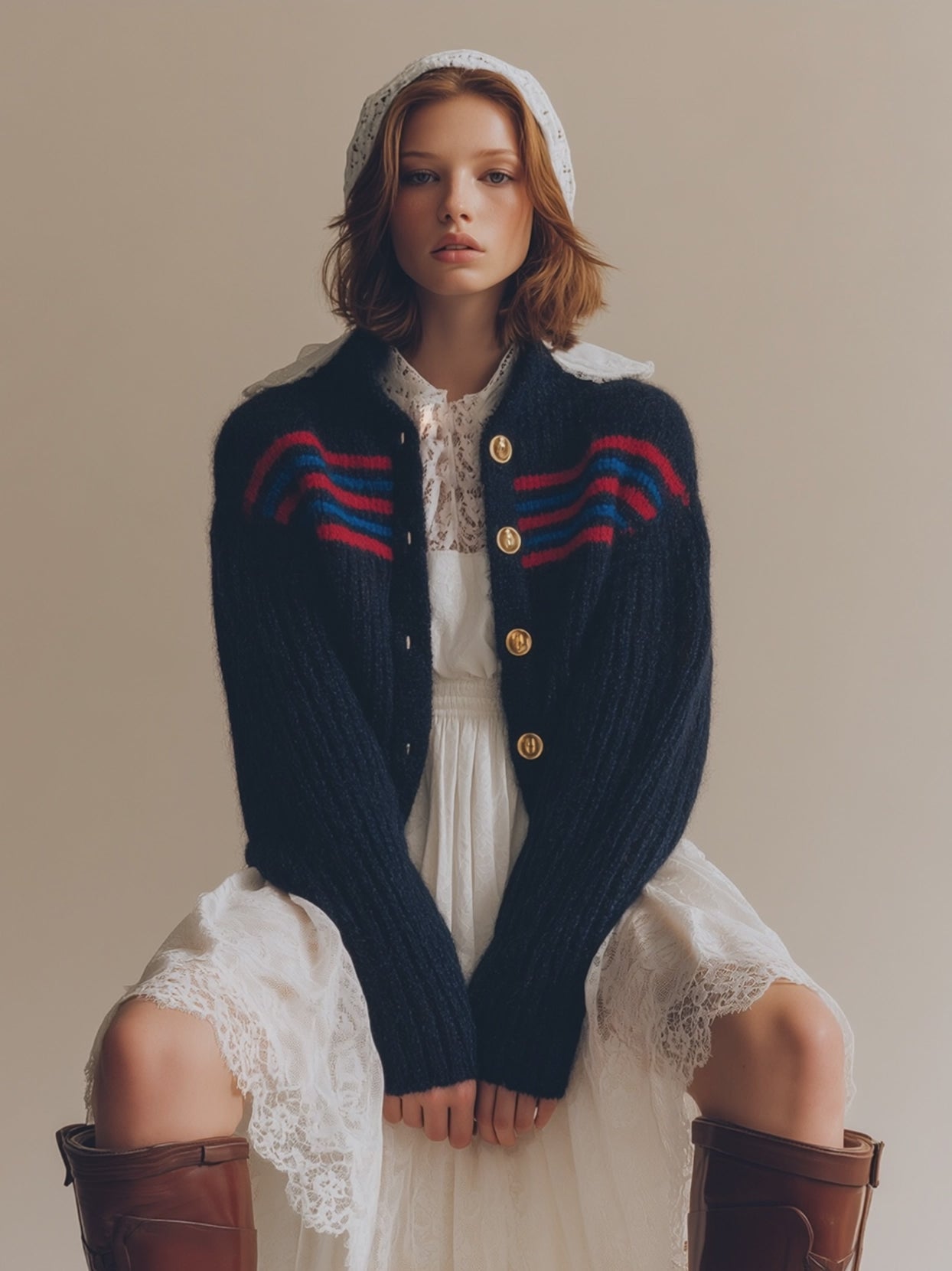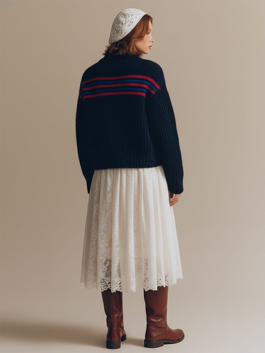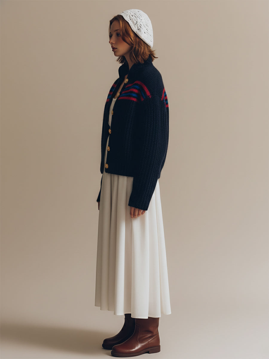 This retro and fashionable red and blue striped navy blue mohair knitted cardigan is a perfect blend of vintage charm and contemporary flair. The rich navy blue base serves as a sophisticated backdrop for bold, eye-catching red and blue stripes that run horizontally across the fabric, giving it a playful yet timeless aesthetic. Crafted from soft mohair yarn, the cardigan feels luxurious against the skin while providing exceptional warmth. Its relaxed fit ensures comfort, making it an ideal layering piece for both casual outings and a stylish evening look. The retro-inspired design evokes nostalgic vibes from past decades, while the modern cut and high-quality knit give it a fresh, wearable update that can be styled effortlessly with a variety of outfits