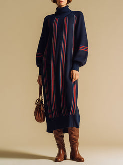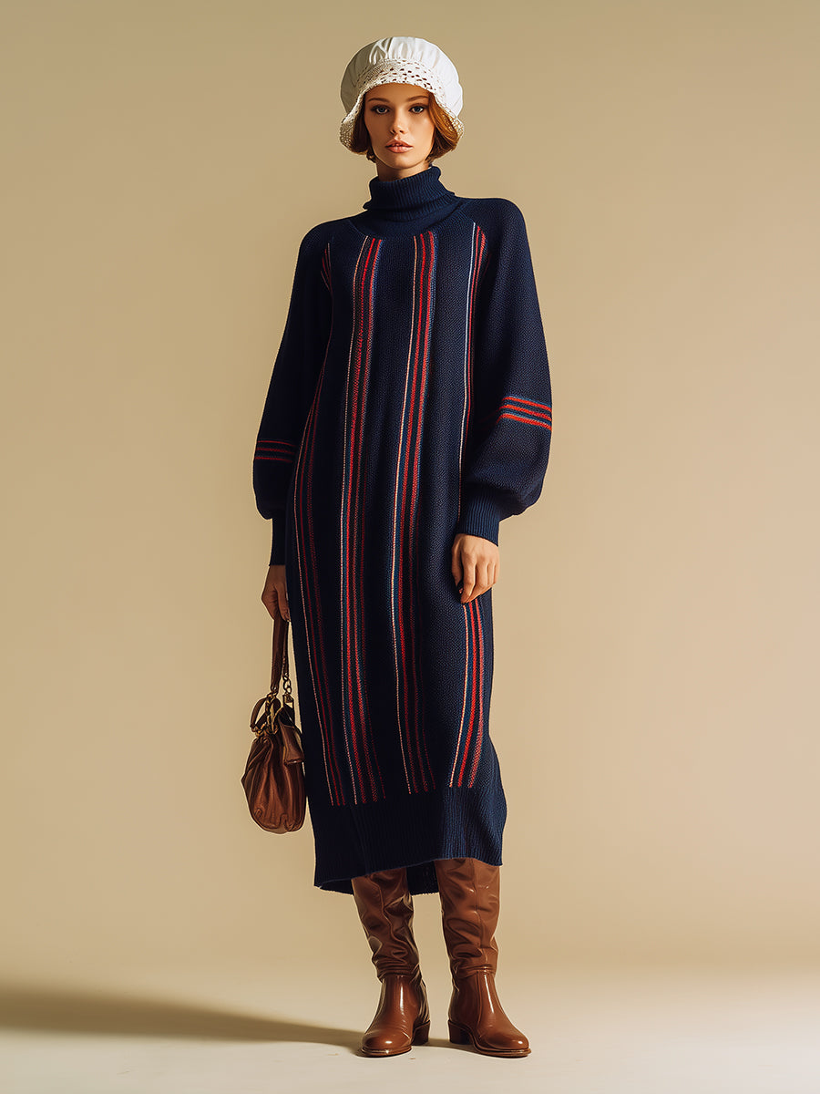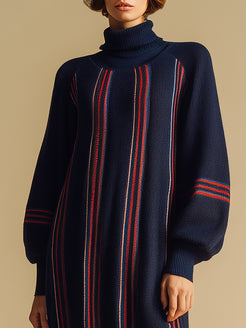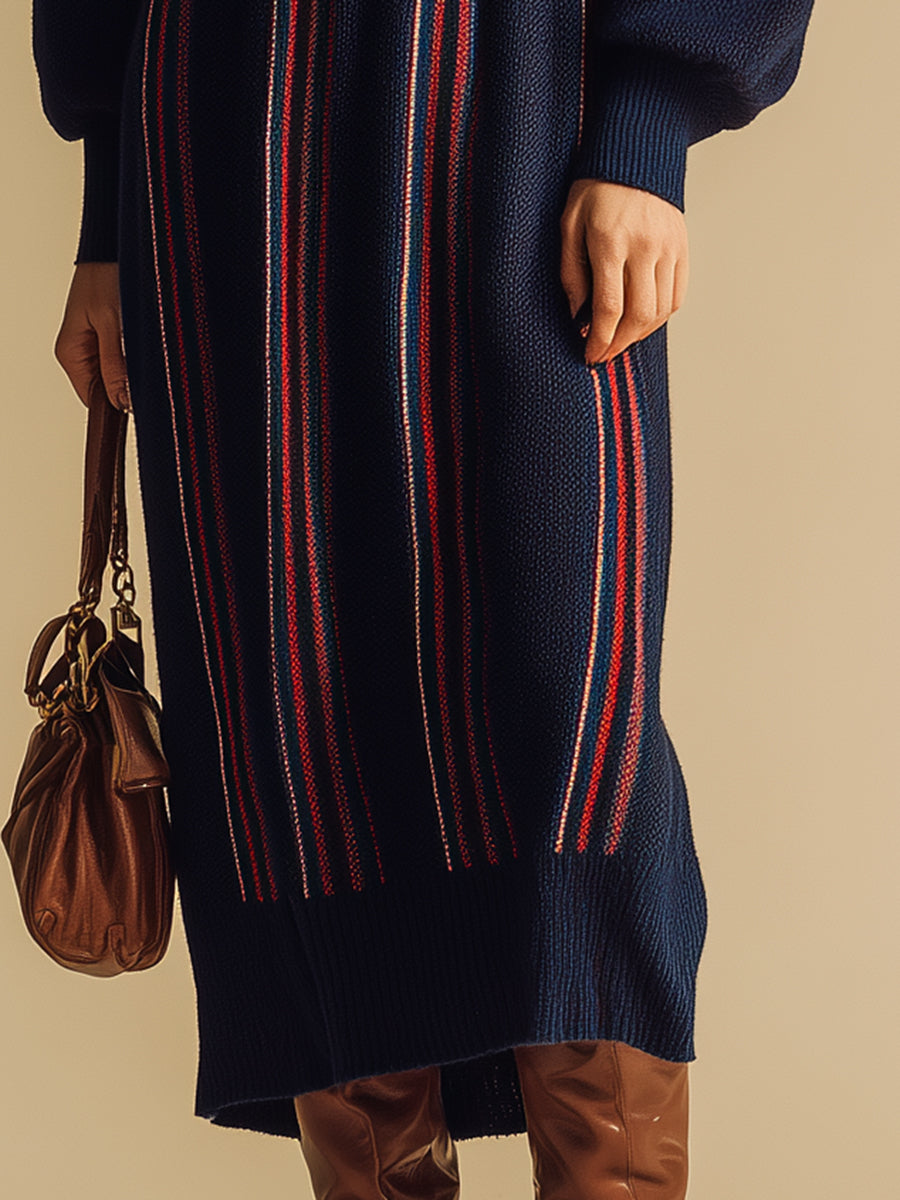Bold, retro, and effortlessly eye-catching, this dark blue knitted maxi dress features striking vertical red stripes that elongate the figure and add a touch of vintage charm. The rich navy knit provides a soft yet structured drape, while the vertical lines bring a flattering silhouette and a vibrant sense of movement. Designed with a classic crew neckline and long sleeves, this dress balances comfort with polished style—making it perfect for transitional weather and year-round layering