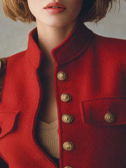 The Retro and Fashionable Stand-Up Collar Pocket Red Woolen Jacket combines classic tailoring with modern flair, making it a perfect statement piece for any wardrobe. Crafted from soft, high-quality wool, this jacket features a structured stand-up collar that adds a bold, geometric touch. The rich red hue brings an eye-catching vibrancy, while the clean lines and minimalist design offer a timeless appeal. Functional front pockets enhance the jacket's practicality, making it not just stylish but also versatile for everyday wear.