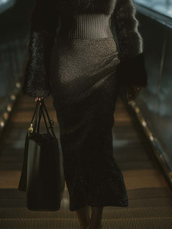 This stunning dress pairs beautifully with a pair of classic black pumps or strappy high-heeled sandals. Accessorize with minimalistic silver or gold jewelry to enhance the dress's glitter elements. For a chic outerwear option, consider a tailored black coat or a faux fur jacket to complement the faux fur details of the dress.