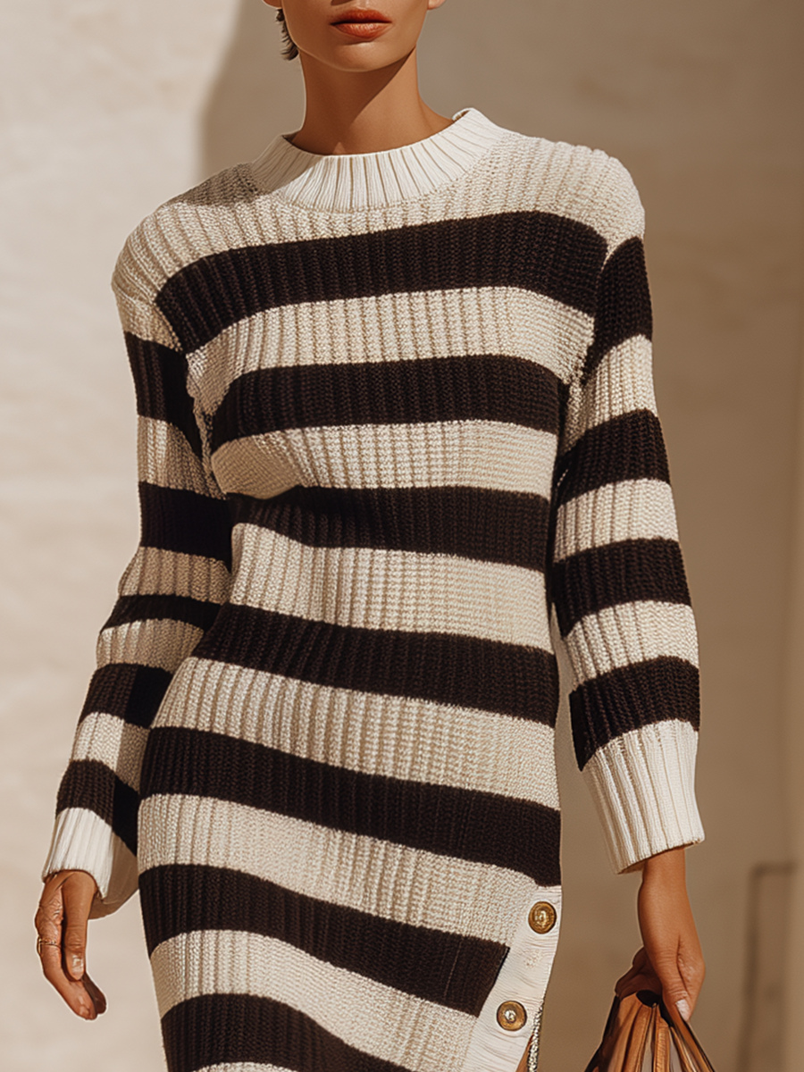 Perfect for casual outings or relaxed gatherings, this dress can be paired with sleek sneakers or ankle boots for a laid-back look. For an elevated style, add a belt to cinch the waist and enhance the silhouette, along with heeled sandals or chic flats. Layering with a denim jacket or a lightweight cardigan also adds dimension for cooler days or nights. Whether you’re enjoying a weekend brunch, heading to a casual outdoor event, or simply relaxing with friends, the retro black and white striped loose knitted midi dress is a versatile and fashionable choice that exudes effortless charm.