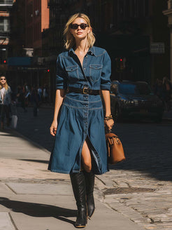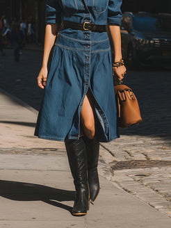This vintage denim skirt is flattering for a variety of body types. Pair it with a variety of outerwear, such as coats or trench coats, for a casual look. Add a silk scarf for a touch of flair. Whether it's a daily outing or a casual get-together with friends, this classic, versatile skirt is a perfect choice for any occasion, showcasing a retro chic.