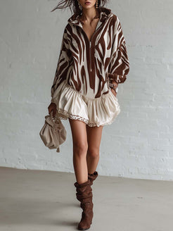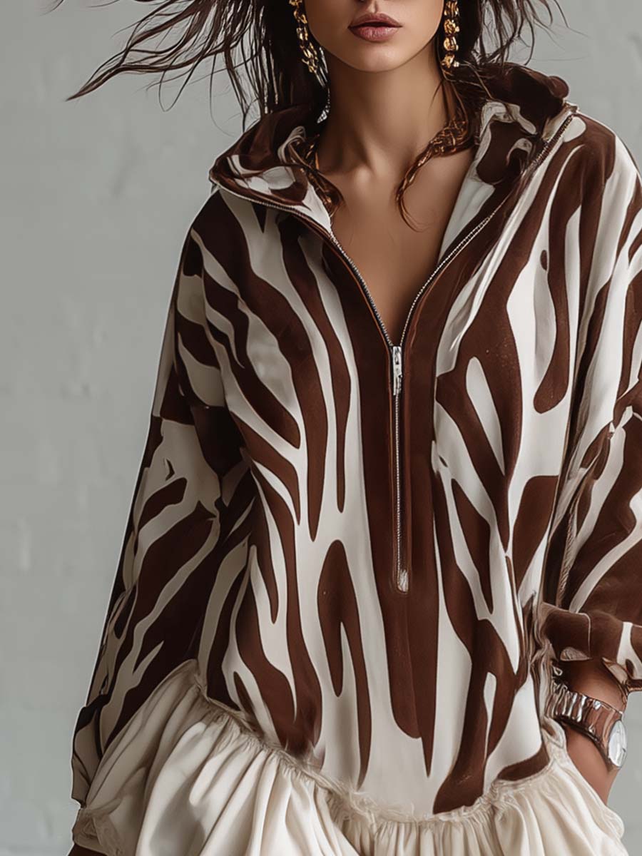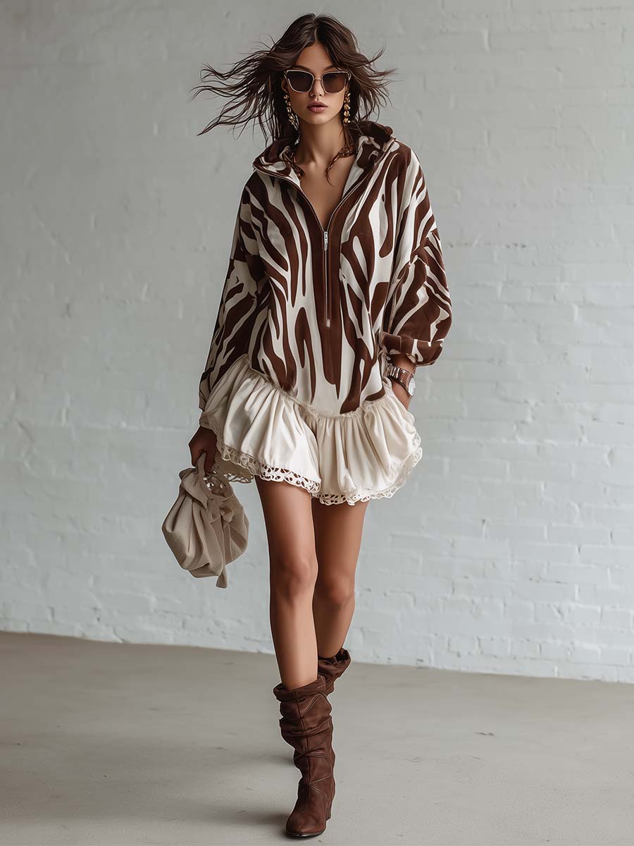 This Retro Casual Sporty Hooded Zip-up is a versatile piece that captures the essence of classic sporty style with a modern twist. The V-neck design adds a touch of femininity, while the ruffled hem gives it an elegant yet playful flair. Featuring a bold brown zebra print, this mini dress is crafted from high-quality cream faux suede, offering both comfort and a chic appearance.