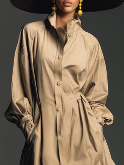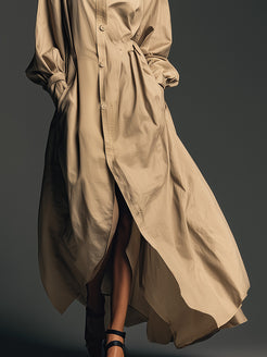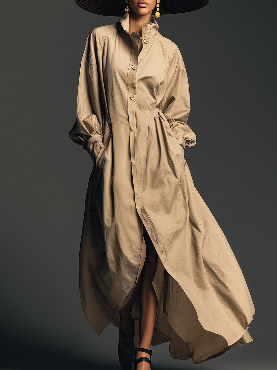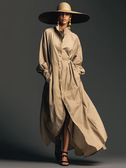 The Retro Fashion Stand Collar Front Button Slit Khaki Cotton Trench Coat Maxi Dress effortlessly blends the sophistication of classic trench coats with the elegance of maxi dresses. Crafted with premium khaki cotton, this piece offers a timeless charm and unbeatable comfort, making it a versatile addition to any wardrobe.