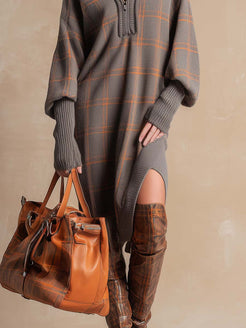 The Retro Comfortable Fashion Front Lapel Zipper Orange Plaid Gray Knitted Slit Midi Dress is an elegantly designed piece that embodies both vintage charm and modern flair. Crafted from a high-quality knit, this dress promises not just style but also exceptional comfort. Its striking orange plaid pattern is juxtaposed with a subtle gray, creating a unique visual appeal.