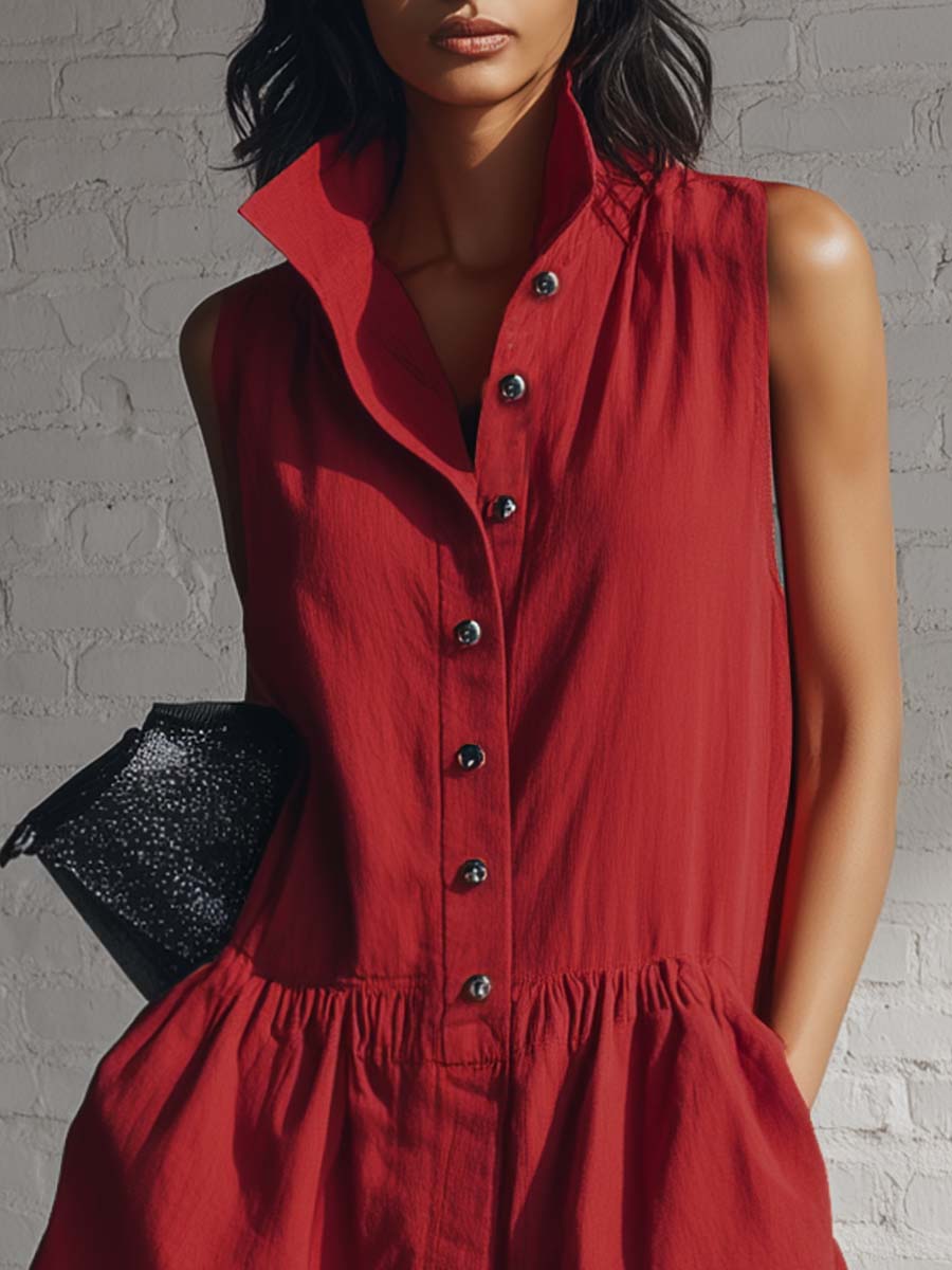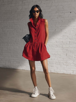 The Retro Comfortable Fashion Sleeveless Lapel Front Button Bubble Hem Red Cotton Mini Dress is the epitome of vintage elegance with a modern twist. Its vibrant red color and unique bubble hem design make it a standout piece in any wardrobe.