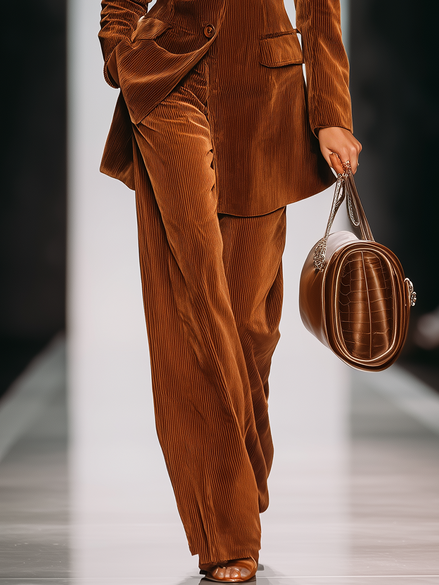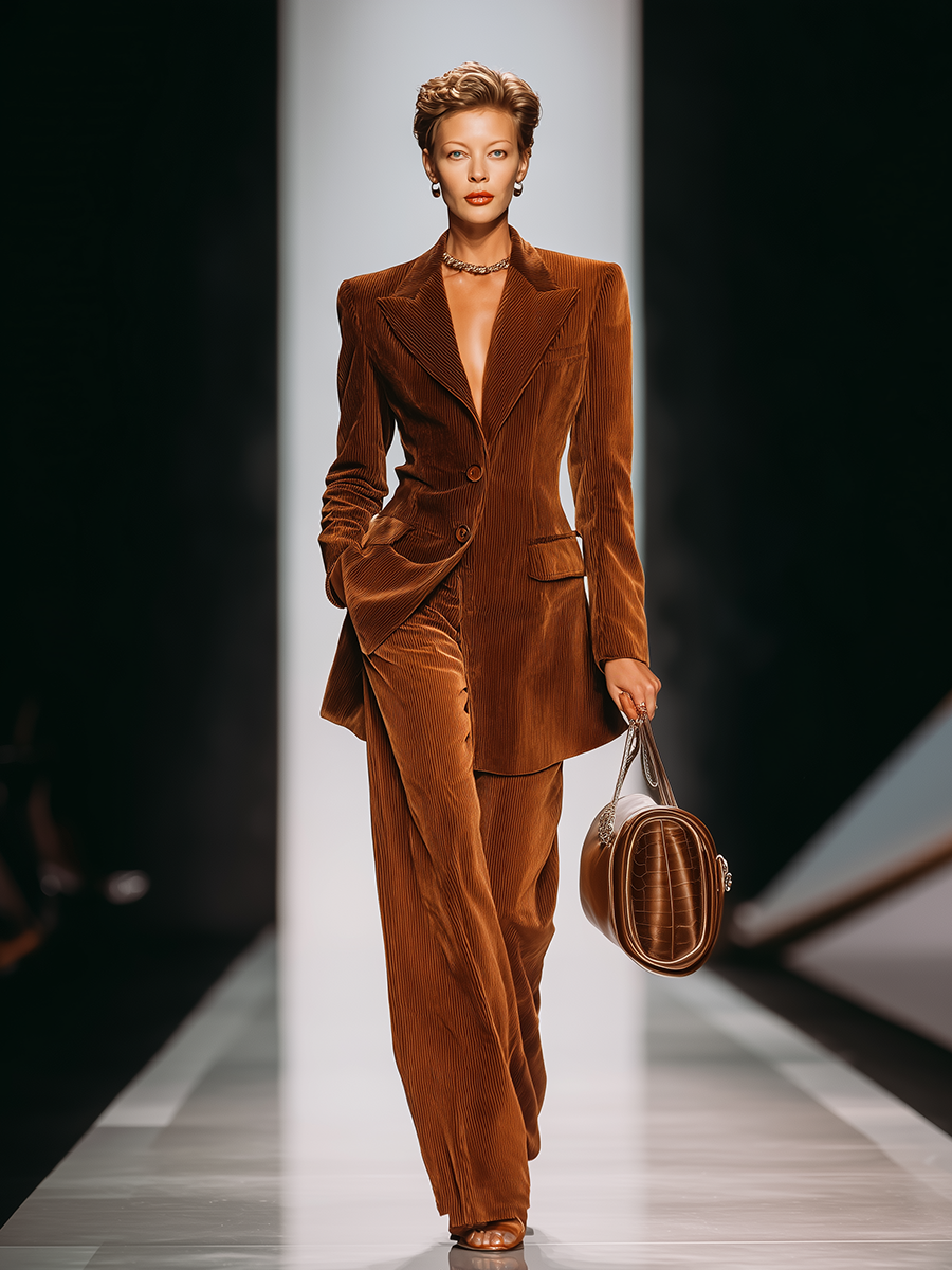 Styling this retro set opens up a world of possibilities. For a polished office look, pair the suit with a fitted turtleneck or a sleek blouse in a complementary color, finishing the ensemble with pointed-toe pumps or ankle boots. Accessorize with a statement belt to cinch the waist and add definition. For a more casual outing, you could opt for a graphic tee or a relaxed knit sweater underneath the jacket, paired with stylish sneakers for a laid-back vibe. Enhance your accessory game with bold earrings or layered necklaces, and don’t forget a tote or crossbody bag to complete the look. This elegant corduroy suit set is a versatile wardrobe staple that showcases your unique style and can easily transition from day to night, making it a favorite for any fashion-forward individual.