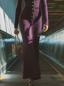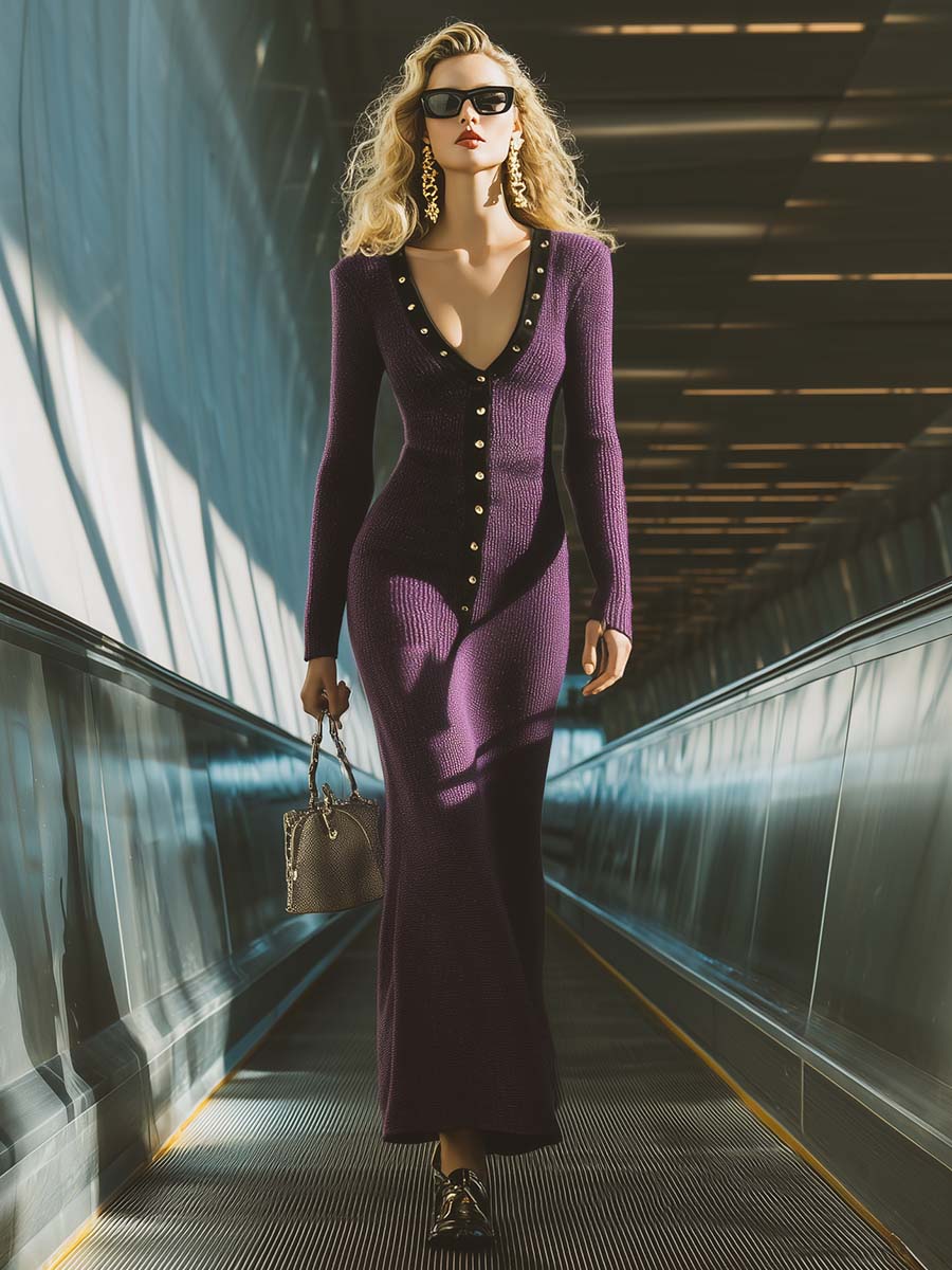 This Retro Exquisite Contrast Color V-neck Button Decoration Dark Purple Knitted Maxi Dress embodies vintage elegance combined with modern sophistication. The dress features a rich dark purple hue that exudes a sense of regal charm, complemented by eye-catching contrast color detailing. Its V-neck design provides a flattering neckline, while the button decorations add a touch of classic style.
