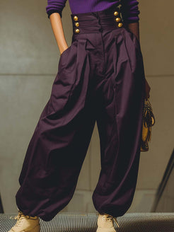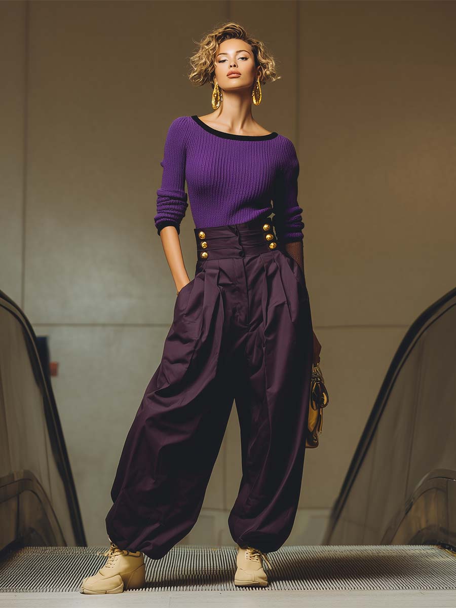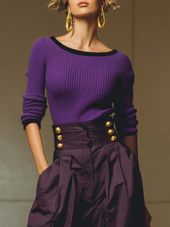 The Retro Exquisite Dark Purple Large Round Neck Knitted Top and Waist Metal Button Wide Pants Set is a stylish ensemble that combines classic design with modern elegance. The top features a large round neck design, providing a sophisticated and timeless look, perfectly paired with an exquisite dark purple hue. The wide pants are accentuated with metallic buttons at the waist, highlighting an exquisite attention to detail that elevates the overall aesthetic.
