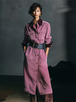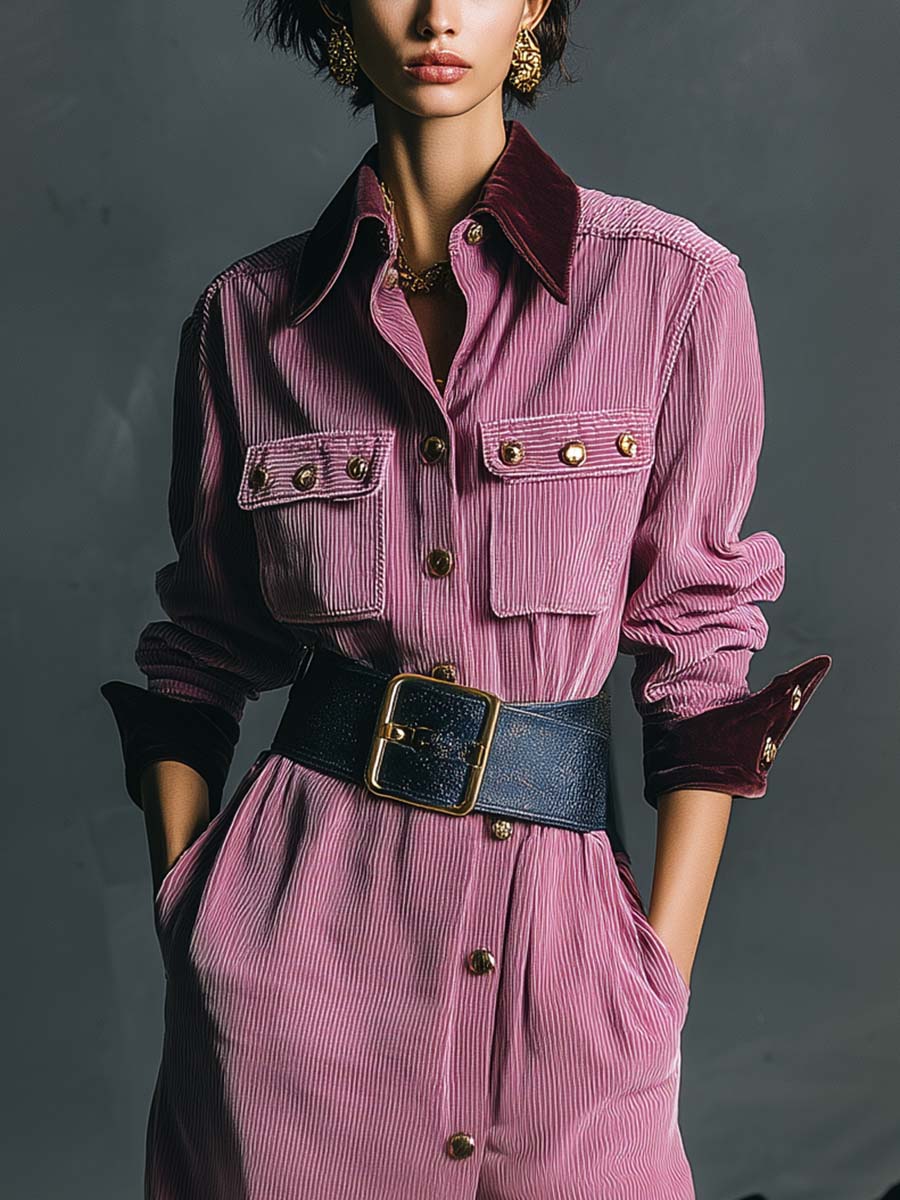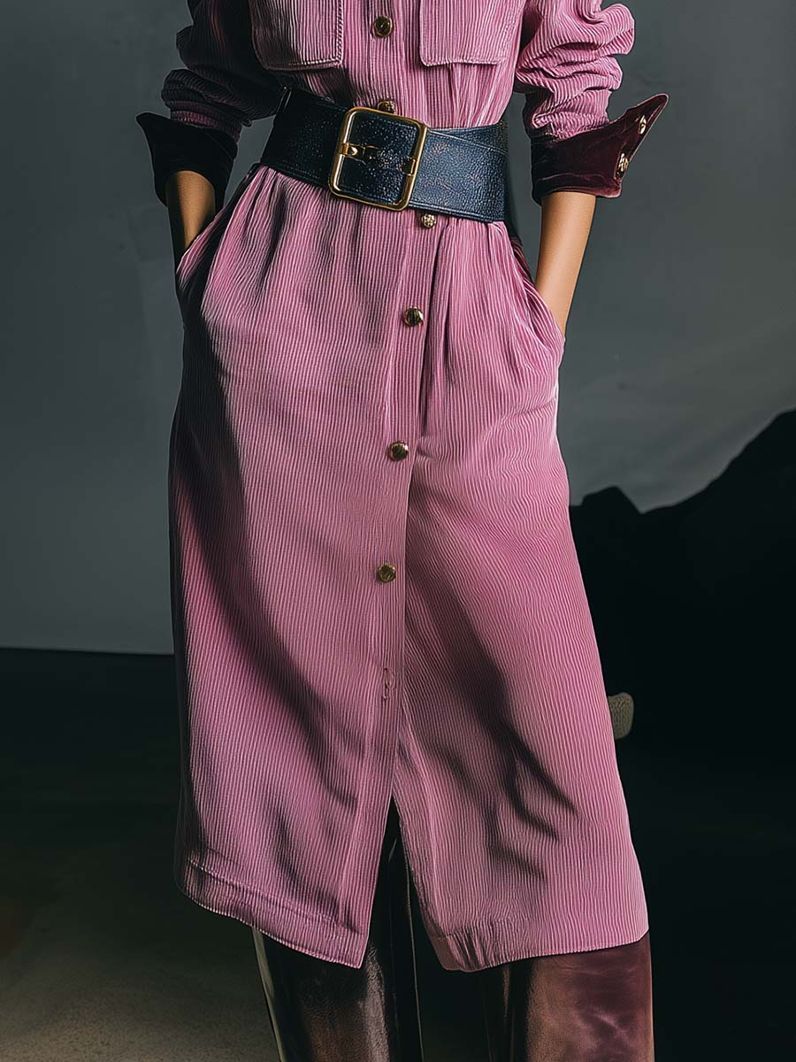 Introducing the Retro Exquisite Handsome Wine Red Contrast Color Front Button Purple Pink Corduroy Midi Dress, a seamless blend of vintage charm and modern elegance. This unique dress features a striking wine red and purple-pink color palette, making it a standout piece for any wardrobe. Crafted from plush corduroy fabric, it exudes sophistication with a hint of retro chic.