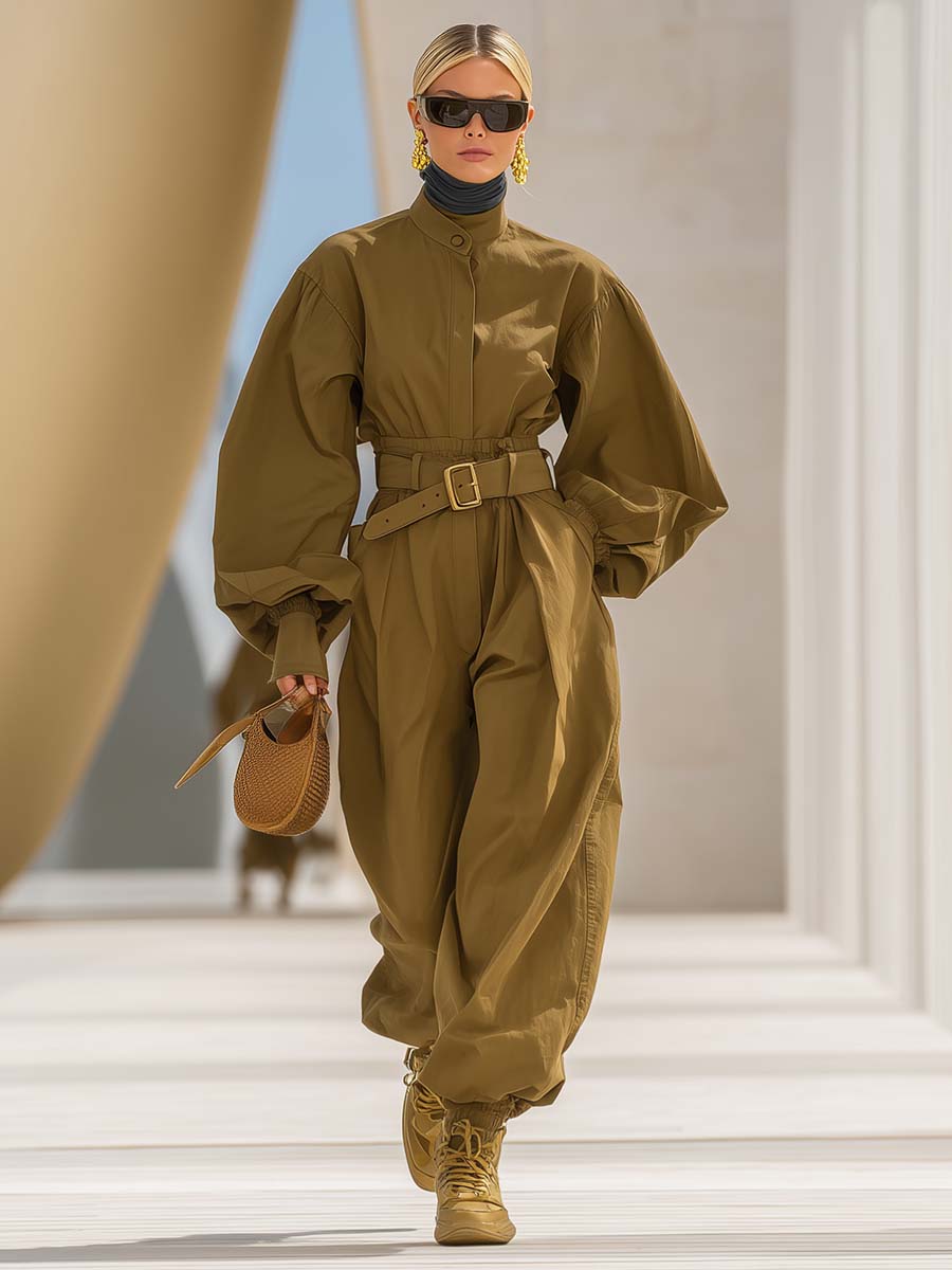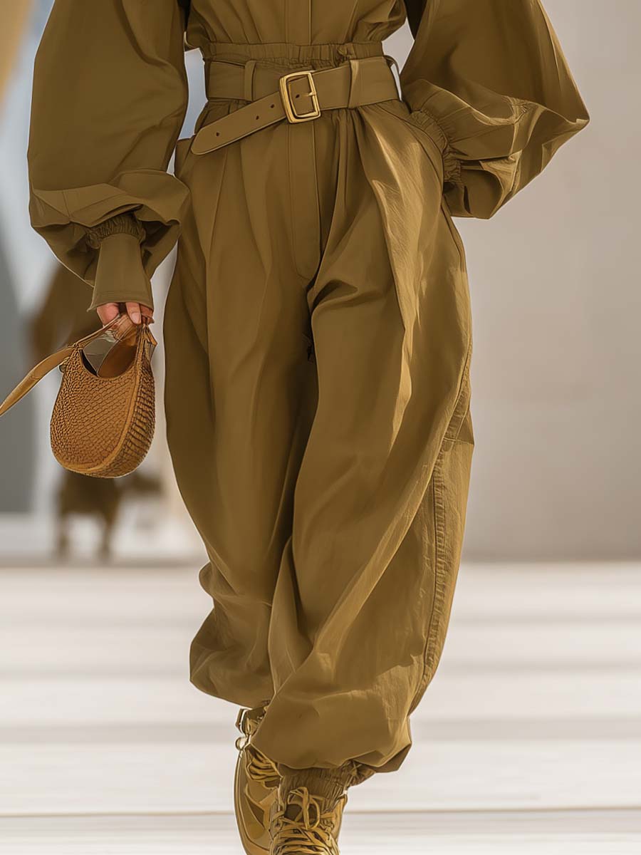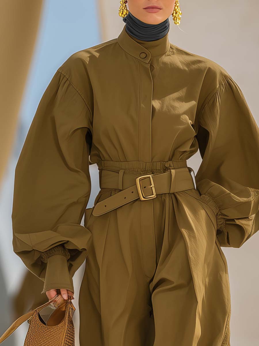 The Retro Exquisite Khaki Small Stand-up Collar Leg-of-mutton Sleeve Top And Wide Pants Set is a perfect blend of vintage charm and modern elegance. The khaki color exudes a classic appeal, while the unique silhouette, featuring a small stand-up collar and dramatic leg-of-mutton sleeves, ensures a standout ensemble. The wide pants enhance the overall look, adding a touch of sophistication to this fashion-forward set.