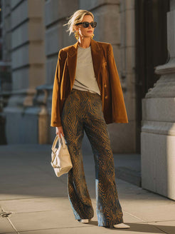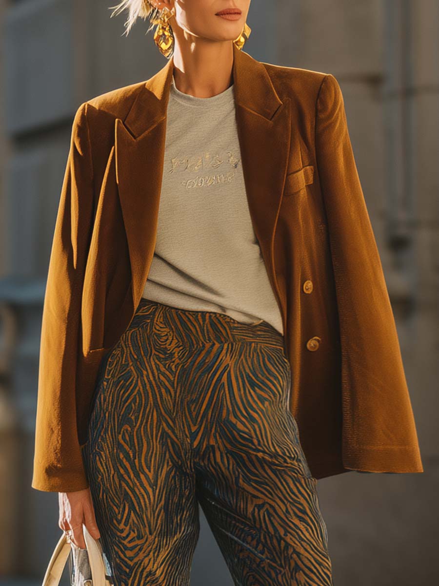 This unique ensemble marries iconic vintage aesthetics with a bold contemporary edge. The suit comprises a rich brown velvet blazer and striking tiger print pants, making it a standout choice for the fashion-conscious individual. The luxurious texture of velvet alongside the fierce print creates an interplay that speaks volumes in style.