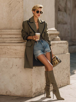 Introducing our Retro Exquisite Street Peak Lapel Black Trim Double-breasted Gray-green Coat, a timeless piece that seamlessly blends classic sophistication with modern street style. Crafted with precision, this coat features a distinctive gray-green hue highlighted by a sleek black trim, adding a touch of elegance to any outfit.