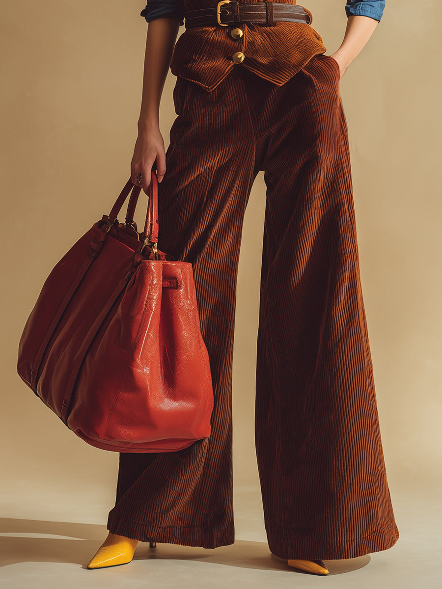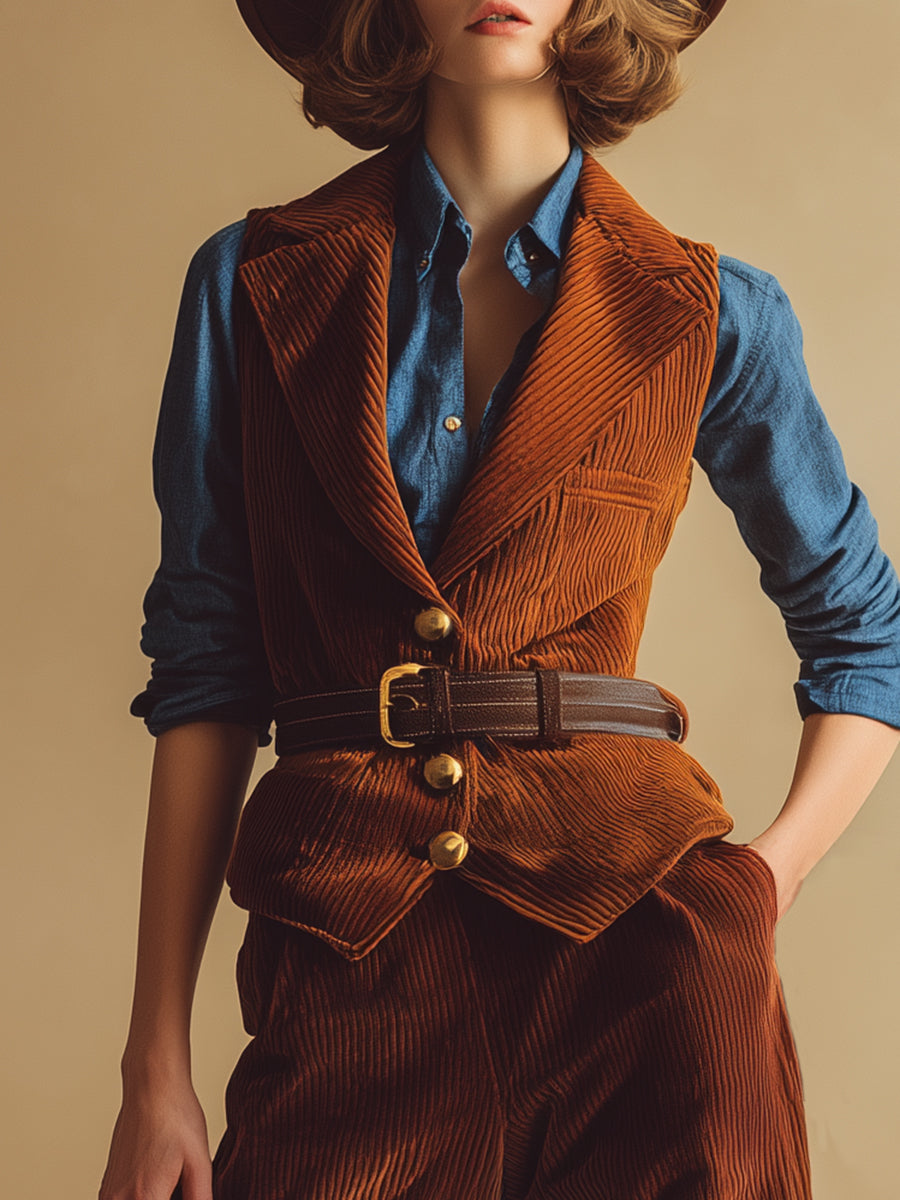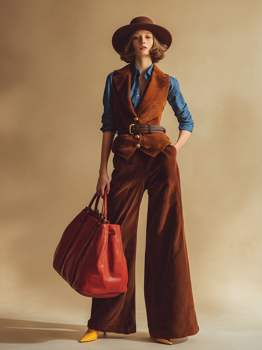 Complementing the vest, the wide-leg pants provide a relaxed yet fashionable fit, allowing for ease of movement while creating a striking silhouette. The flattering cut balances the fitted vest perfectly, making it a great choice for both casual and dressier occasions. Style it with ankle boots for a laid-back vibe, or pair it with heeled mules for a more polished look. Whether you’re heading to a brunch with friends, shopping at the local market, or enjoying a night out, the Retro Fashion Belt Vest and Wide-Leg Pants Reddish Brown Corduroy Set offers a unique blend of retro style and contemporary comfort that keeps you looking chic and fashionable.