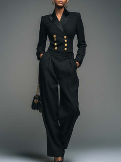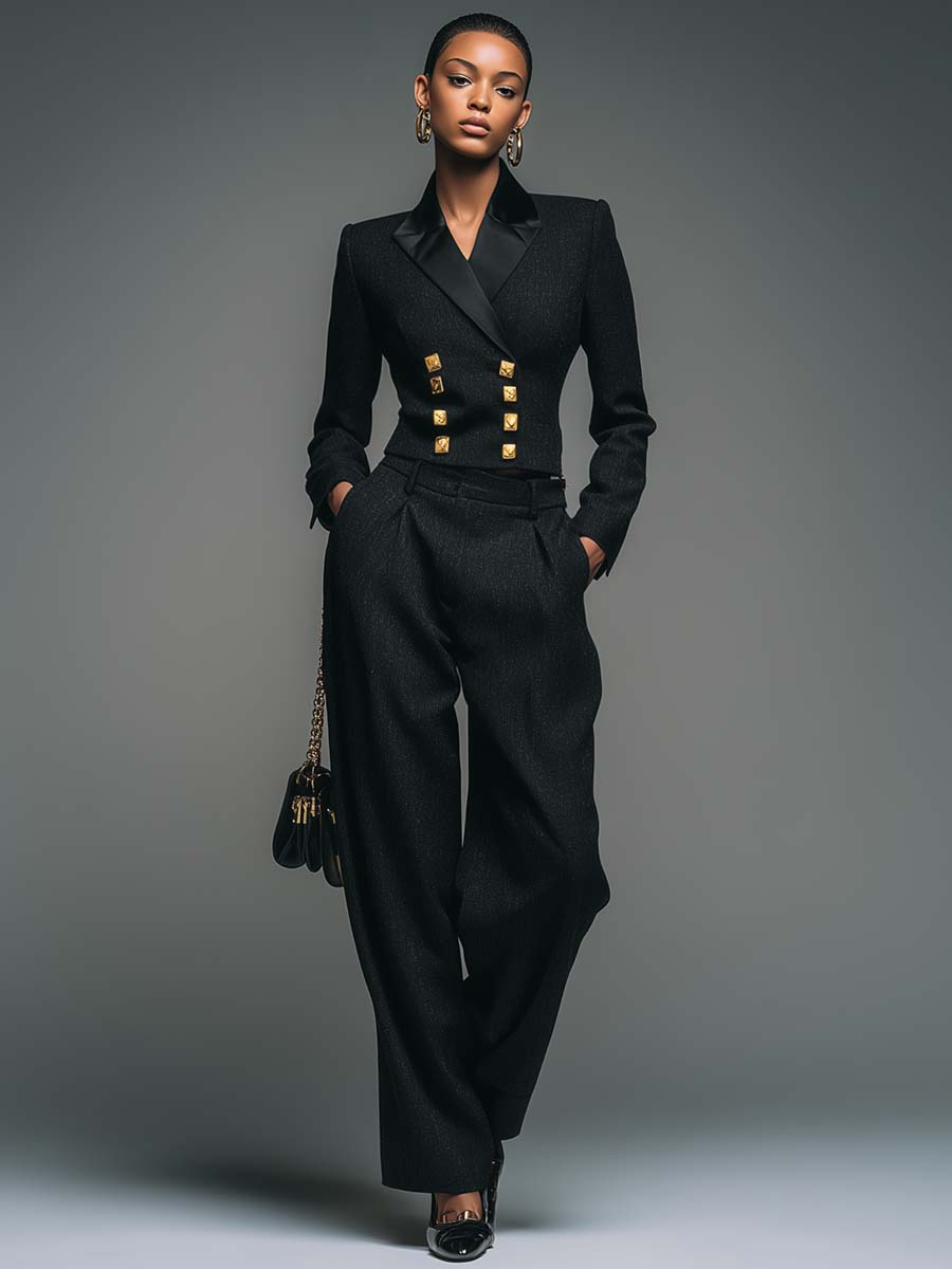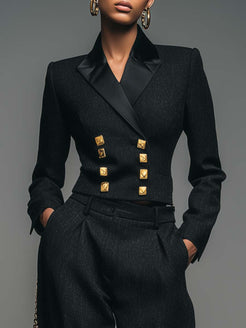 2.Design: Classic black, peaked lapels, metal double-breasted buttons, cropped design