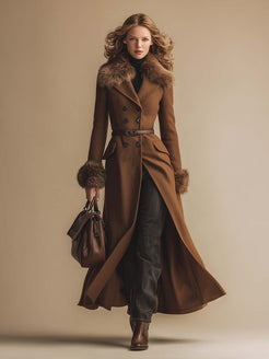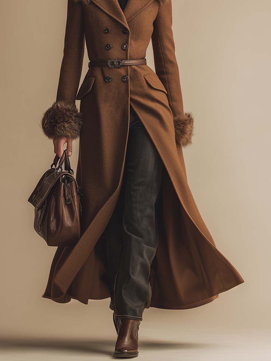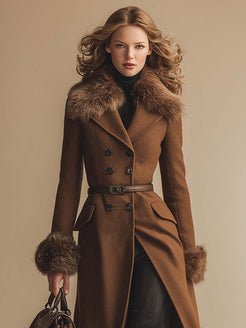 This vintage-chic brown cashmere coat is a versatile addition to your wardrobe, combining style and comfort. In cooler weather, pair it with jeans and a black turtleneck for warmth and comfort. The fur collar and cuffs make it a winter must-have.