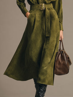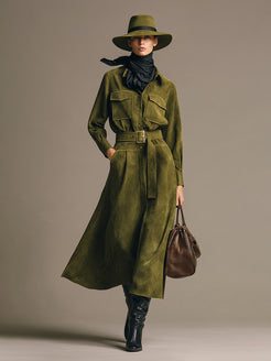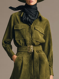 This retro fashion green faux suede leather workwear midi dress is a bold statement piece that seamlessly blends vintage-inspired style with modern functionality. The rich green hue and the soft, textured faux suede material evoke a nostalgic, 70s-inspired aesthetic, while the midi length adds a sophisticated, work-appropriate touch. The dress is tailored to flatter the figure, with a fitted bodice and a gently flared skirt that creates a flattering silhouette. Designed for those who want to bring personality into their professional wardrobe, this dress offers both comfort and style, making it a perfect choice for a chic day at the office or a stylish meeting. The faux suede provides a luxurious feel while being cruelty-free, making it an ethical yet fashionable option.