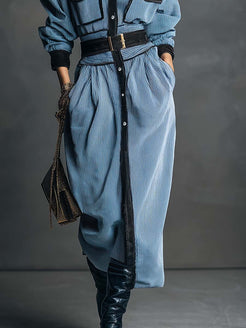 The Retro Fashion Handsome Black Trim Front Button Light Blue Corduroy Midi Dress is a stunning blend of classic vintage style and contemporary elegance. Crafted from premium light blue corduroy fabric, this midi dress offers a luxurious feel and a sophisticated look. The addition of black trim detailing around the buttons elevates the overall design, adding a touch of contrast and definition.