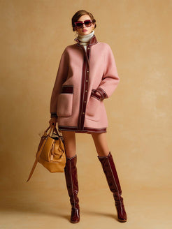 This Retro Fashion Lapel Mini Coat brings together a vintage style with modern aesthetics. Featuring a vibrant pink hue enhanced by statement burgundy leather trim, this coat exudes a playful yet sophisticated charm. The front button design and tailored lapels add a classic touch, while its mini length offers an effortlessly chic appeal.