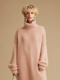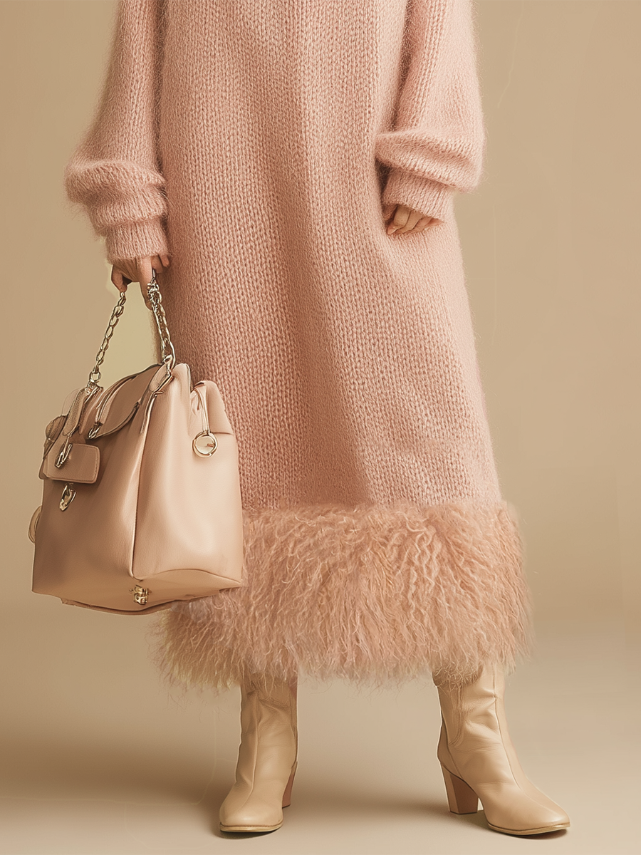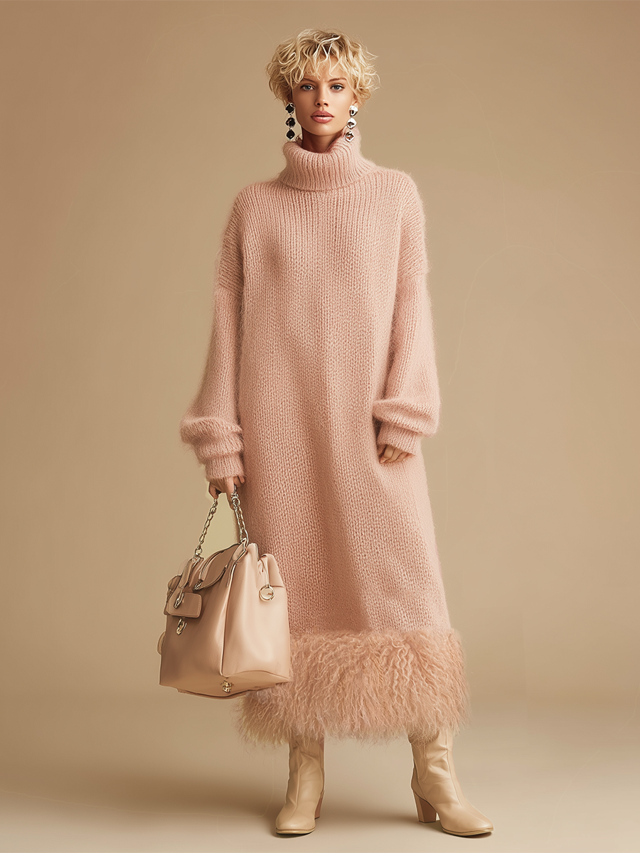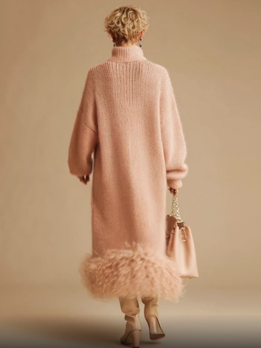 This thick pink knit midi dress with a turtleneck and furry hem for fall and winter perfectly blends style and comfort. Crafted from premium knit fabric, it offers warmth and a vintage-inspired style. The turtleneck adds a touch of sophistication and provides extra warmth during the colder months. A must-have for fall and winter.