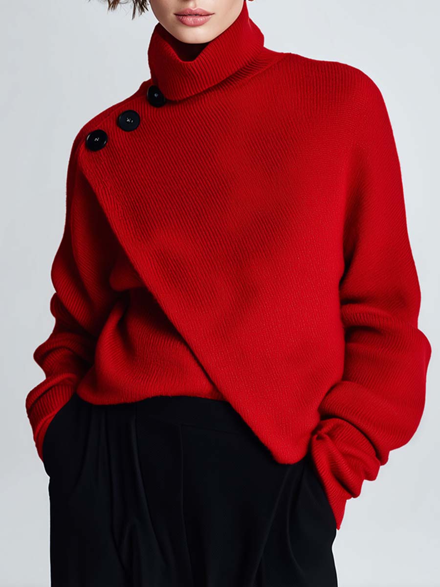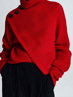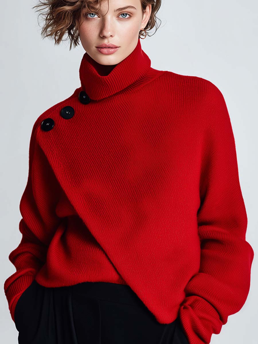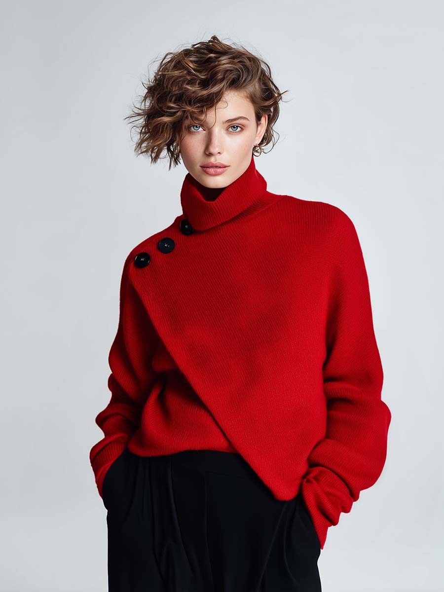 This retro-chic red knit sweater is a versatile addition to your wardrobe, combining style and comfort. Pair it with a coat or jacket for warmth in cooler weather. The irregular cut adds a touch of personality and sophistication. The button embellishment adds a touch of flair.