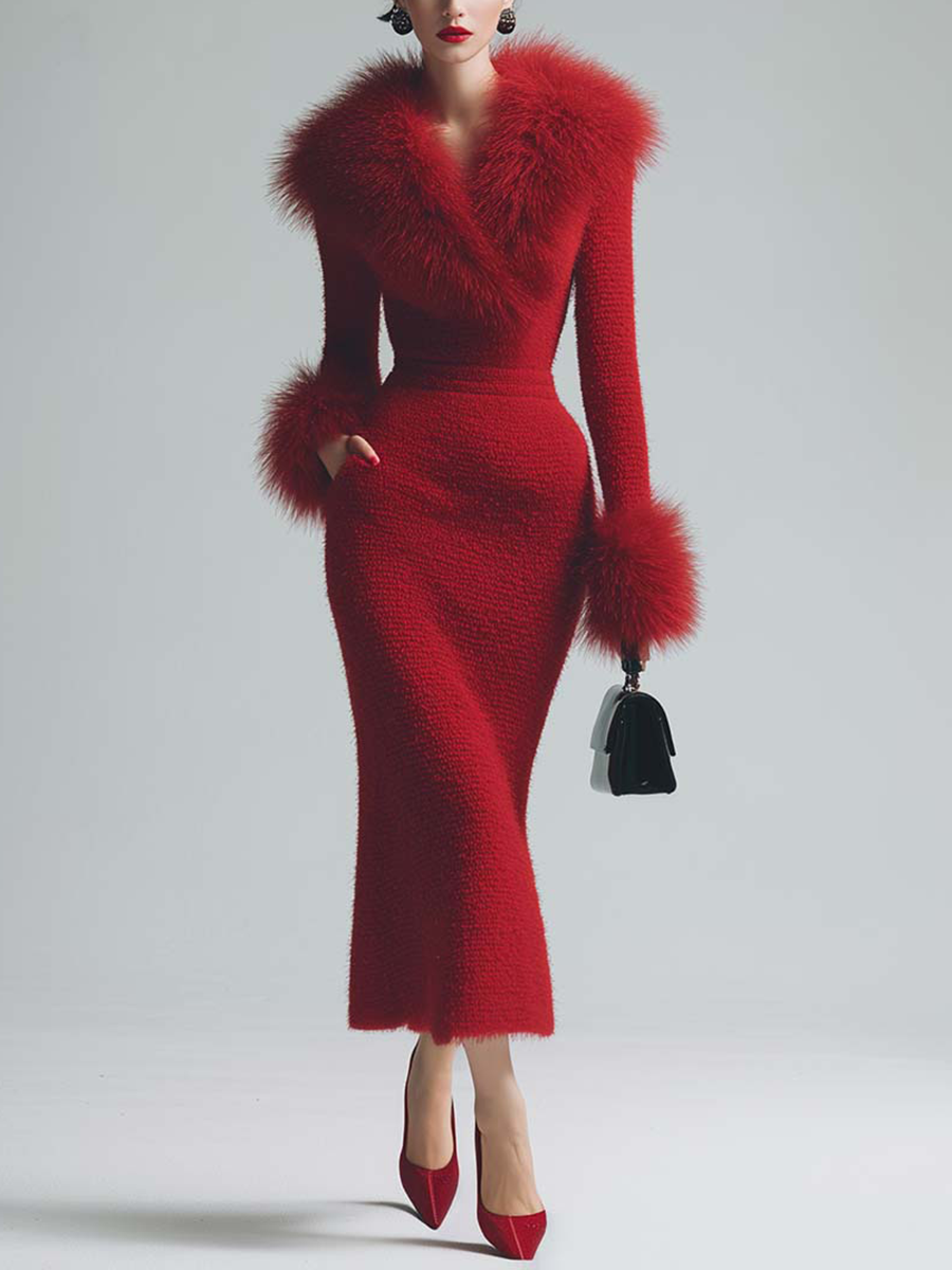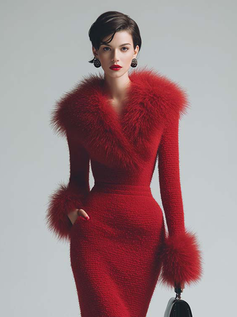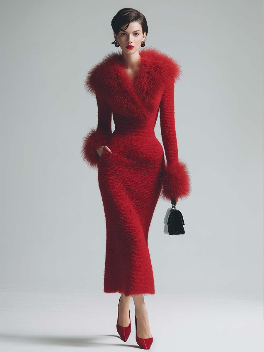 This stylish red knit midi dress is a gorgeous, sexy fitted midi dress. The shearling collar adds a touch of luxury and elegant charm. It's a wardrobe essential for both casual and formal occasions.