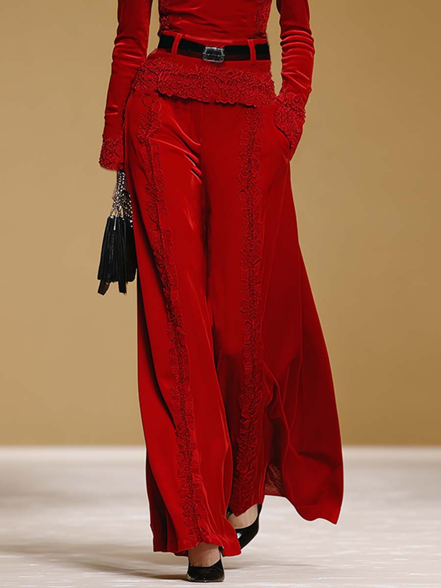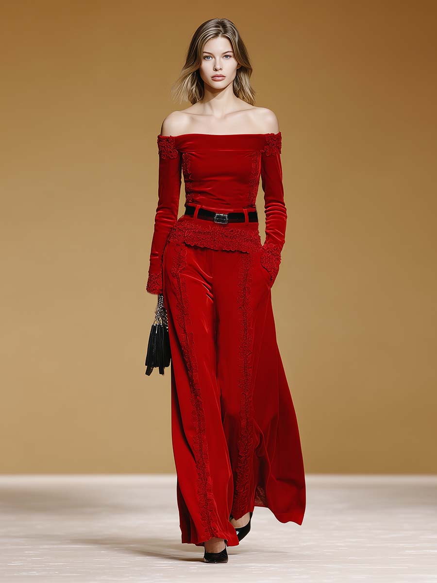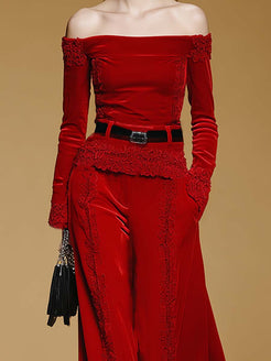 This retro-chic red velvet bateau neckline lace pants set blends vintage elegance. Crafted from soft velvet, it exudes a vintage feel, and the classic red color exudes ultimate sophistication. The lace design throughout the pants flatters the legs.