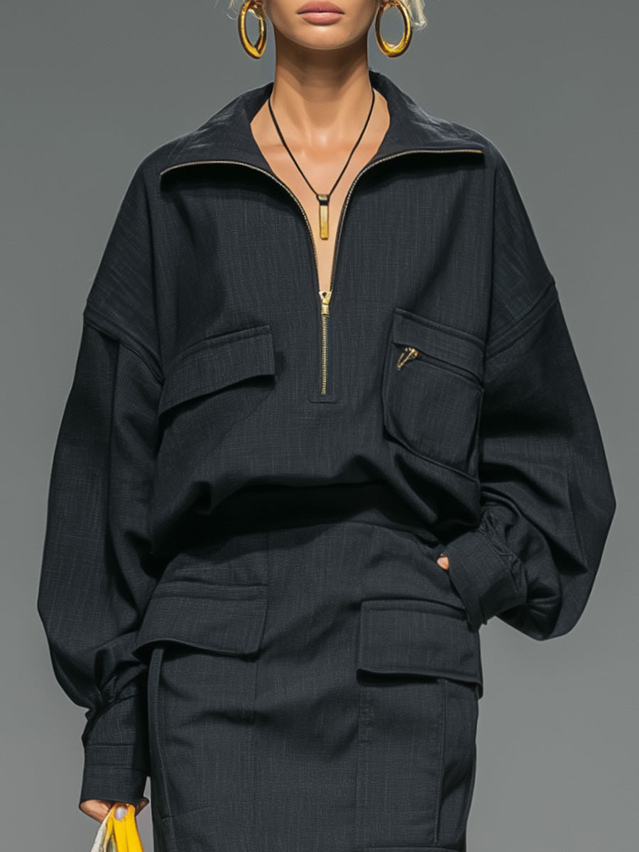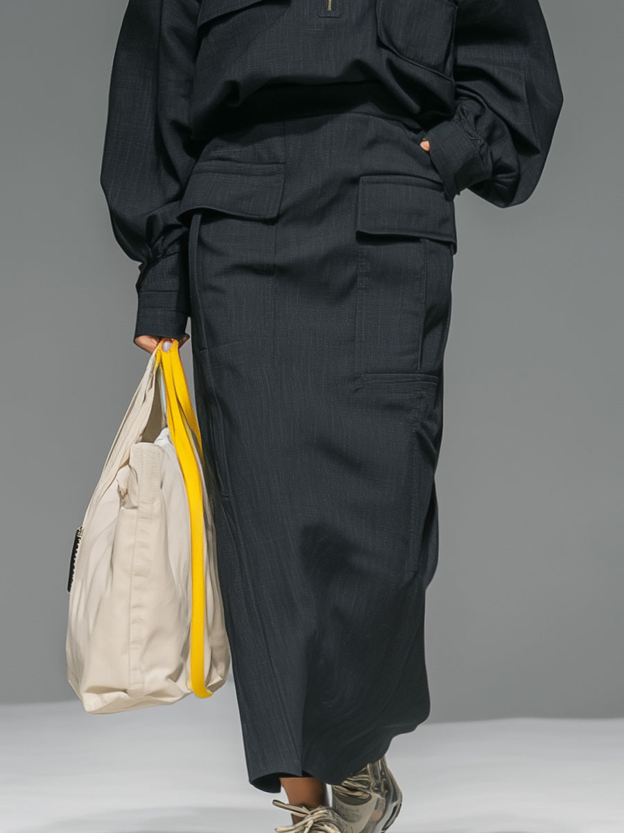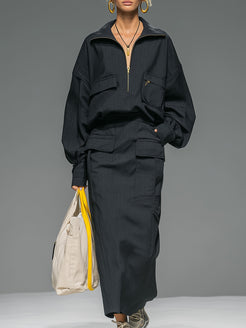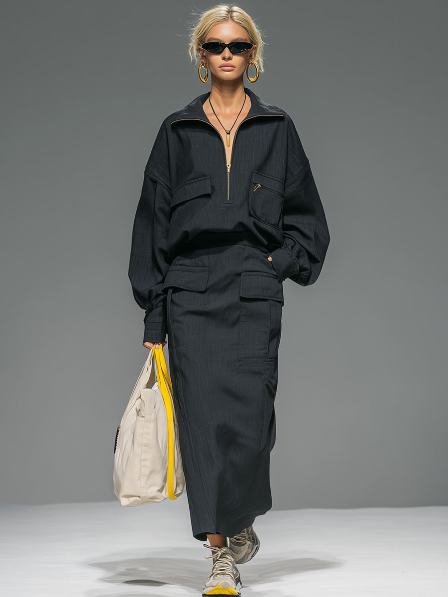 The Retro Fashion Sports Black Lapel Front Zipper Work Pocket Top And Long Skirt Set is a stylish and functional outfit that embodies a retro sporty aesthetic. This two-piece set features a sleek black color with a modern flair, perfect for casual outings or a stylish work environment. The top has a lapel collar with a front zipper, adding a contemporary touch, and includes convenient work pockets for added utility. The long skirt boasts a streamlined silhouette that exudes elegance and sophistication.