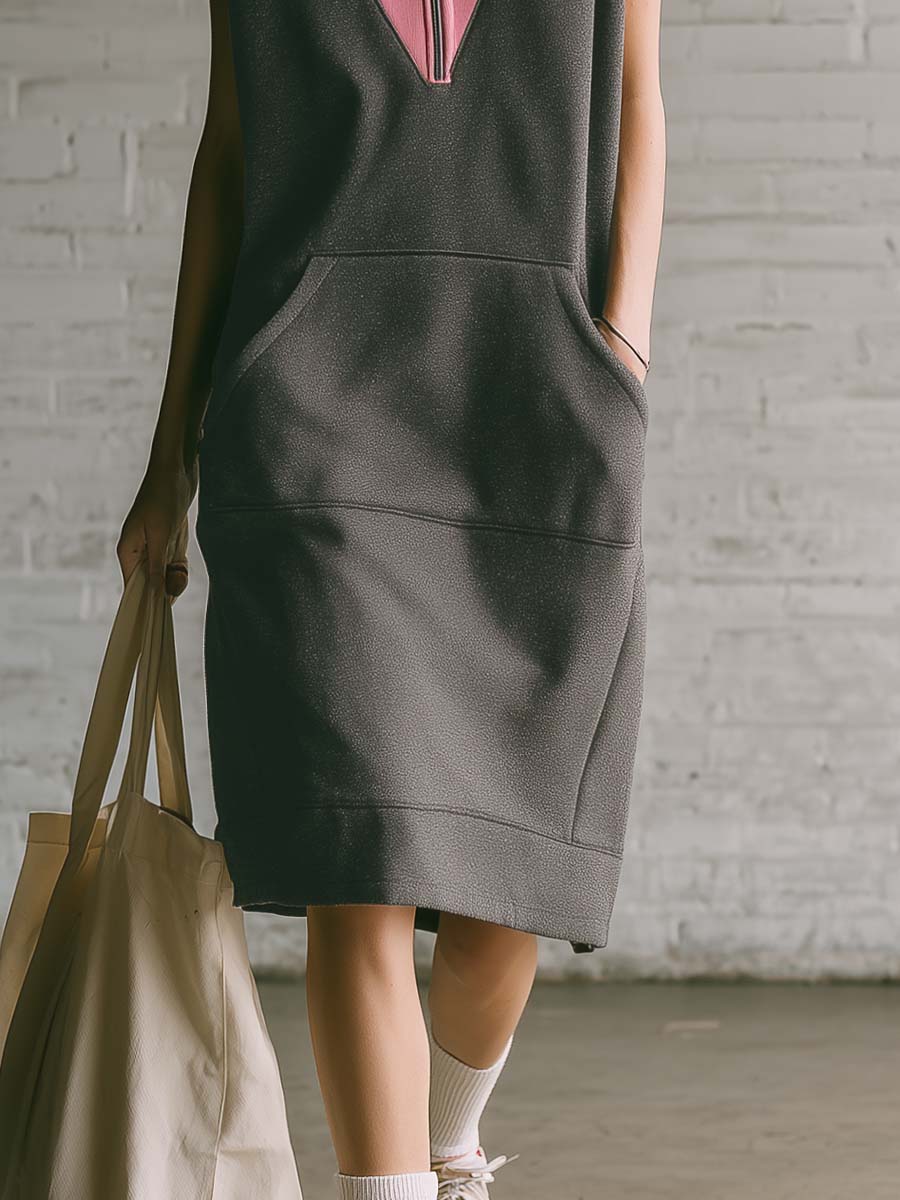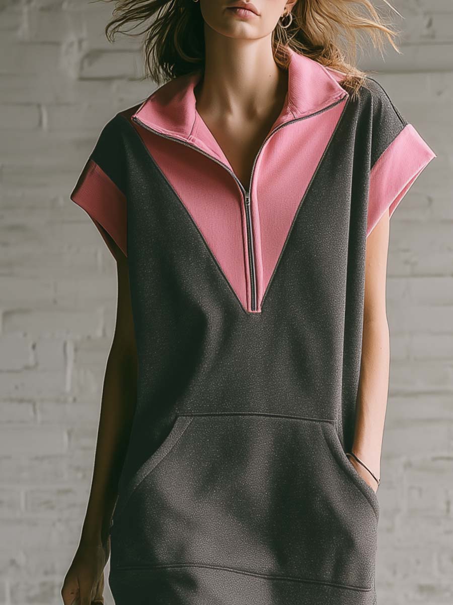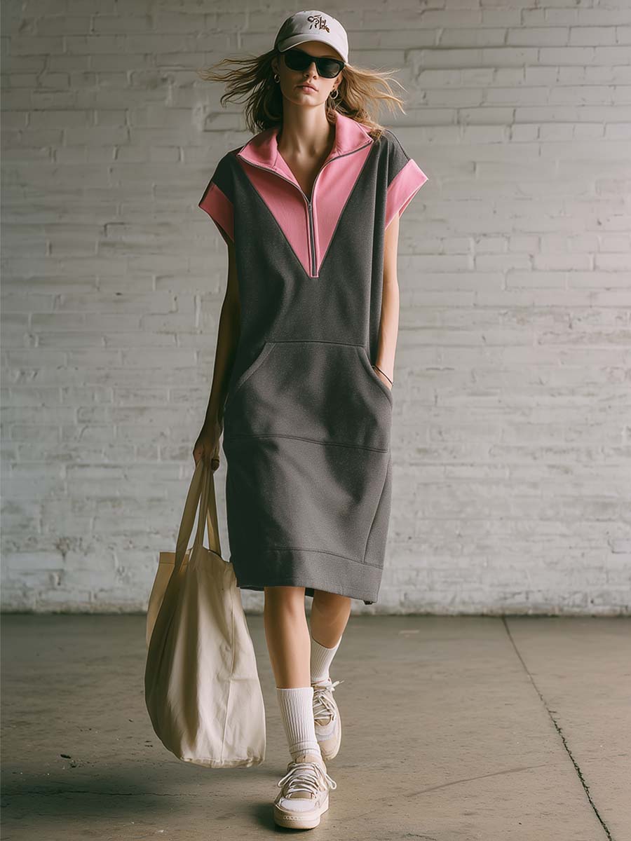 This retro fashion sporty midi dress is a stylish blend of vintage and modern trends. Featuring a striking contrast between pink and dark gray, this cotton dress is both fashionable and comfortable. It comes with a sporty collared front and a convenient front zipper, making it versatile for various occasions.