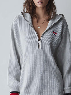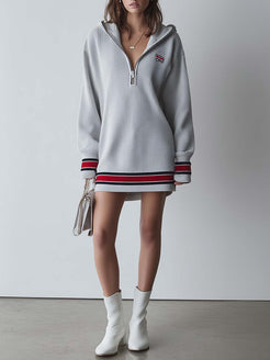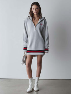 This elegant knitted mini dress combines retro fashion with a sporty flair. Crafted in a light gray hue, it offers a versatile addition to any wardrobe. The dress features a chic V-neck design complemented by a practical hood, adding a unique touch to the overall silhouette.
