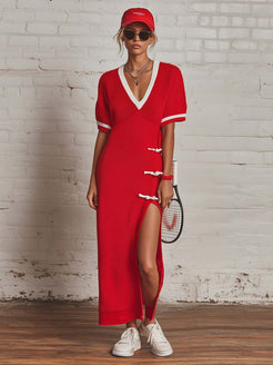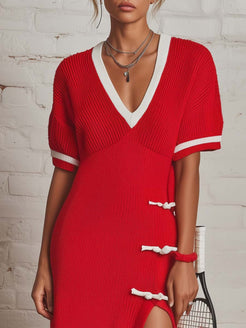The Retro Fashion Sporty V-neck Short-sleeved White Trim High-slit Red Knitted Midi Dress is a stunning blend of classic design with a modern twist. It is crafted from a comfortable and soft knit fabric that hugs your curves gracefully. The dress features a sporty yet elegant V-neckline and short sleeves, enhanced with a distinctive white trim that adds a touch of contrast and sophistication. The daring high-slit design offers both movement and a hint of allure, making this midi dress a bold choice for any occasion.