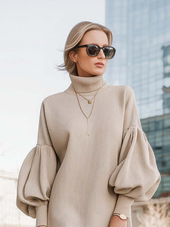 Pair this knit dress with knee-high boots and a slender handbag for a sophisticated look perfect for work or a dinner date. The balloon sleeves add a touch of design and a flattering silhouette; layer it over a stylish jacket for added warmth in cooler months.