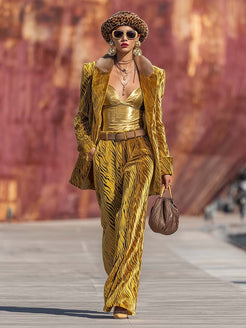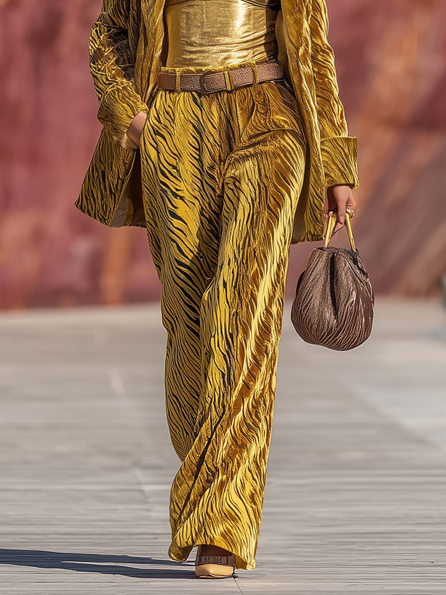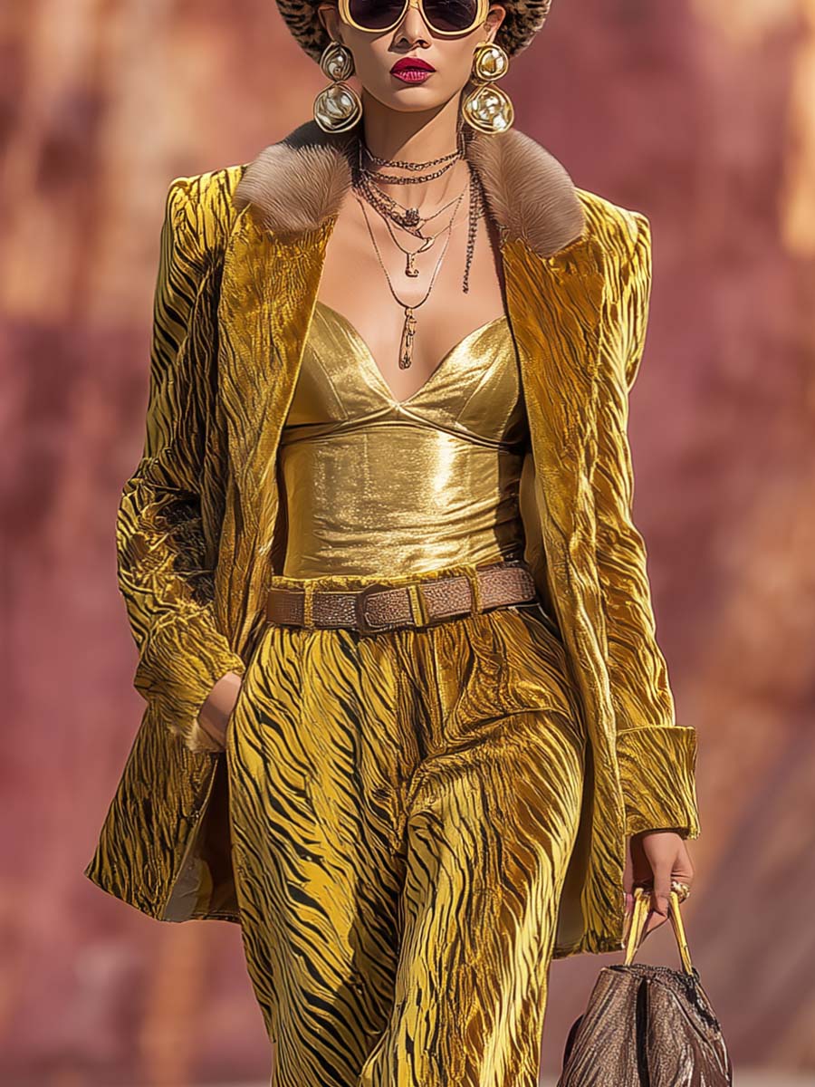 This Retro Personality Street Gold Velvet Tiger Print Faux Fur Collar Blazer and Wide-leg Pants Suit is a bold fashion choice for those who want to make a statement. The suit features a luxuriously soft velvet fabric adorned with an eye-catching tiger print, bringing a touch of wild elegance to your outfit. The faux fur collar on the blazer adds a unique and sophisticated twist, enhancing the overall vintage appeal.