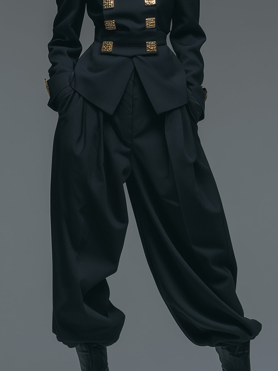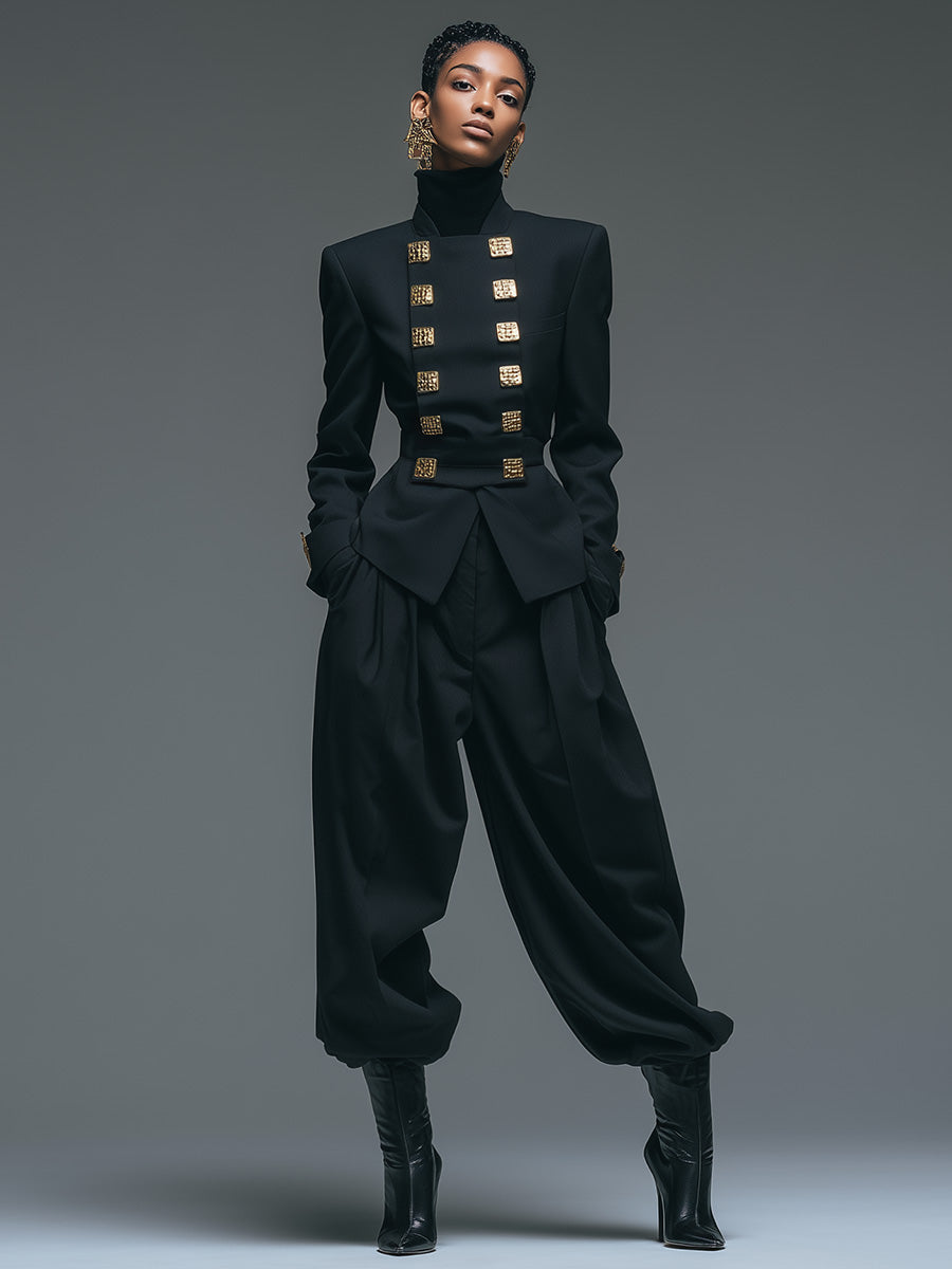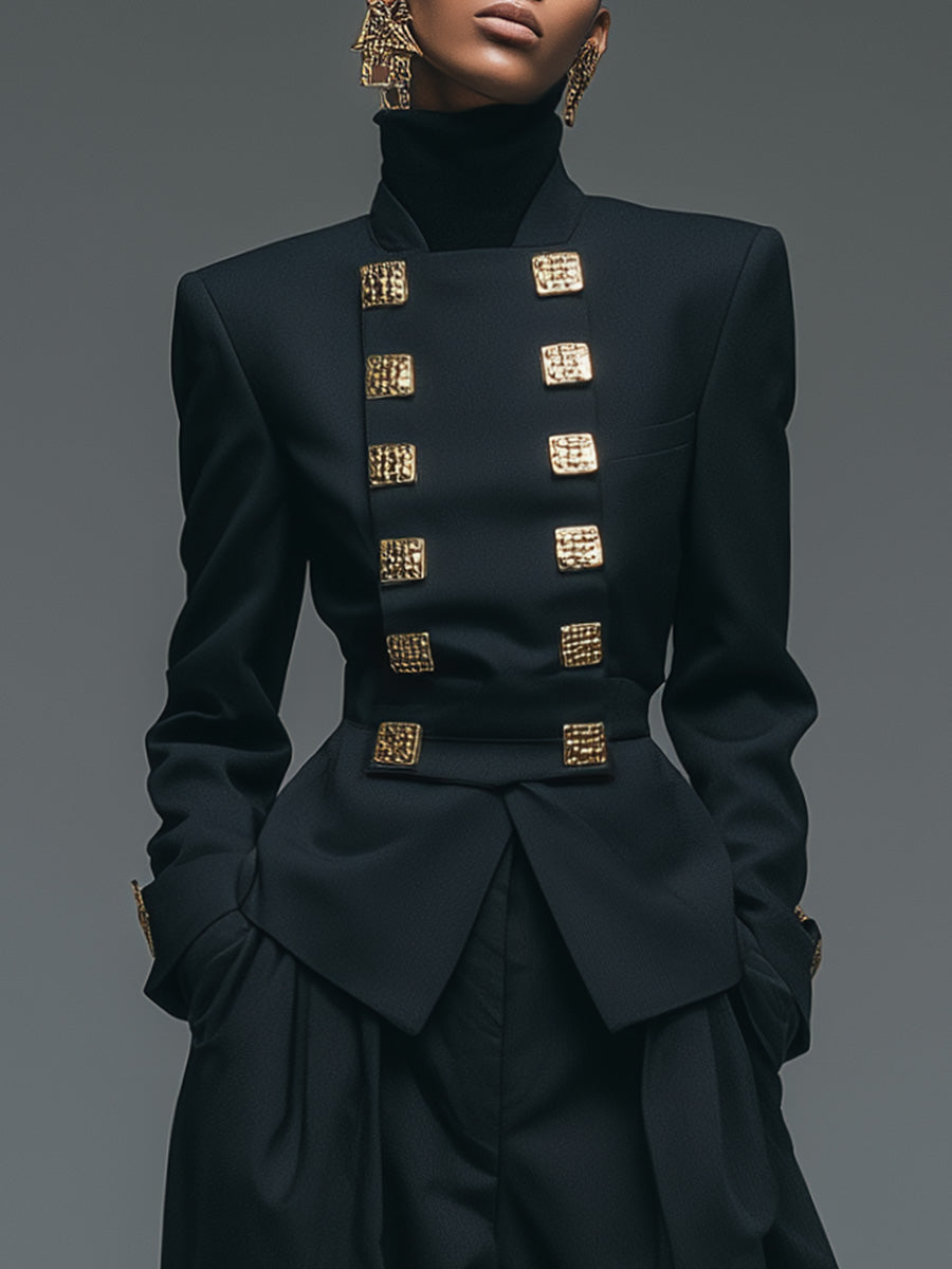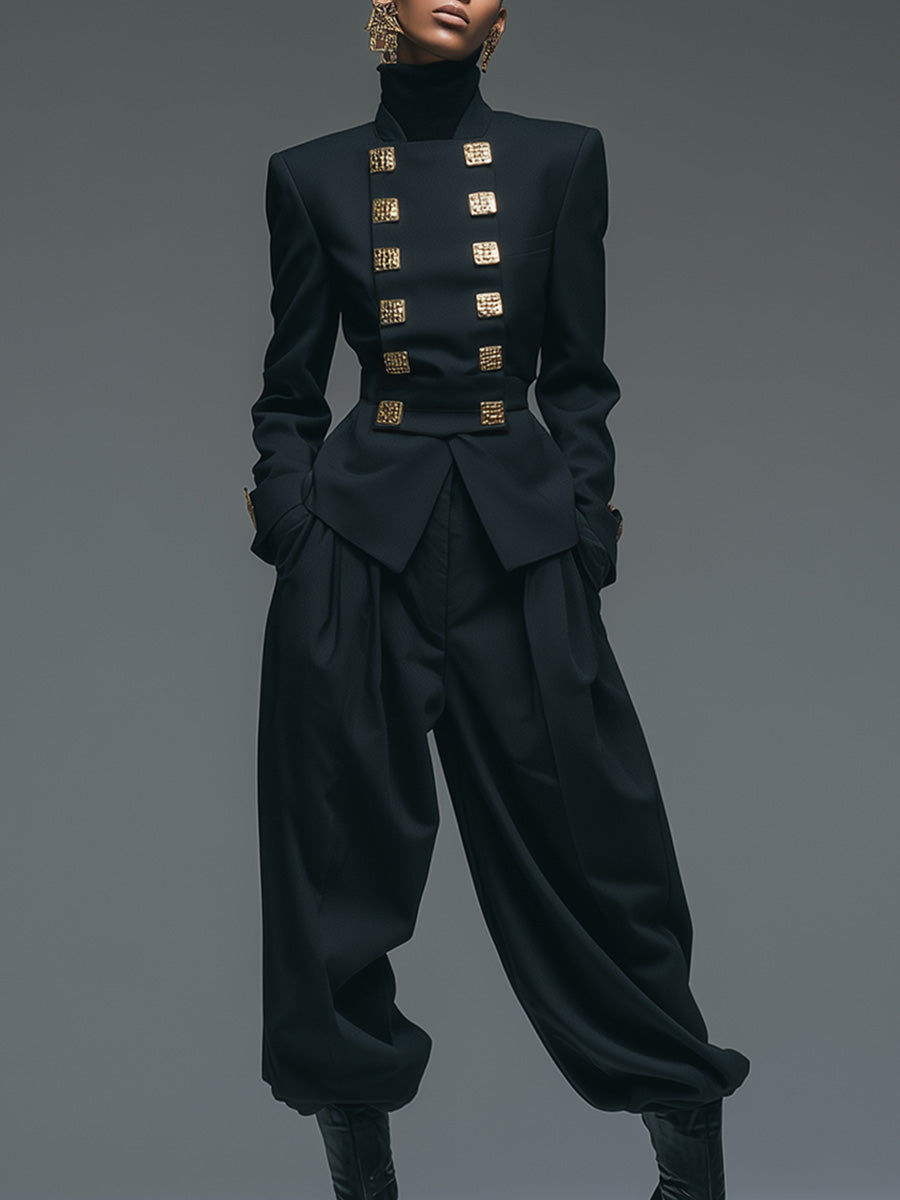 This Retro Stand-up Collar Double-breasted Metal Decoration Suit showcases a modern yet classic design, emphasizing sleek and stylish tailoring. The black blazer and wide pants create a sophisticated X-shaped silhouette, translating to a timeless fashion statement suitable for various occasions.
