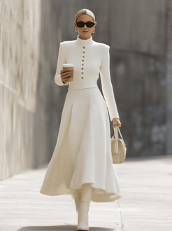 Whether paired with heels and statement jewelry for an evening event or ankle boots and a cross-body bag for brunch, this crew-neck sweater and skirt set perfectly blends style and comfort. This elegant set allows for effortless style and seamless transitions from day to night!