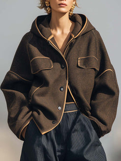 The Retro Street Hooded Beige Trim Brown Woolen Loose Jacket is a perfect blend of style and comfort. Crafted from high-quality woolen material, this jacket features a unique design with a retro feel, combining modern trends with classic elements. The beige trim on the hood adds a chic touch, while the oversized fit makes it a versatile piece that can be layered over a variety of outfits.
