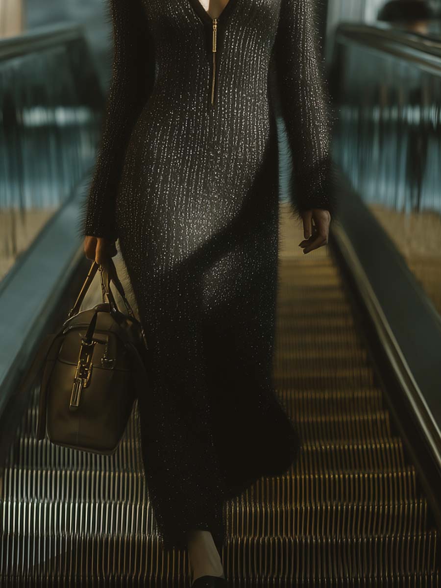 Discover elegance with our Retro Stylish V-neck Front Zipper Black Knitted Maxi Dress. This dress is the embodiment of sophistication, crafted from high-quality knitted fabric, ensuring comfort and a perfect fit. The front zipper adds a modern twist to its classic design, making it a versatile piece for any occasion.