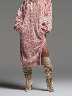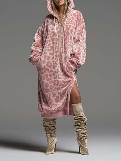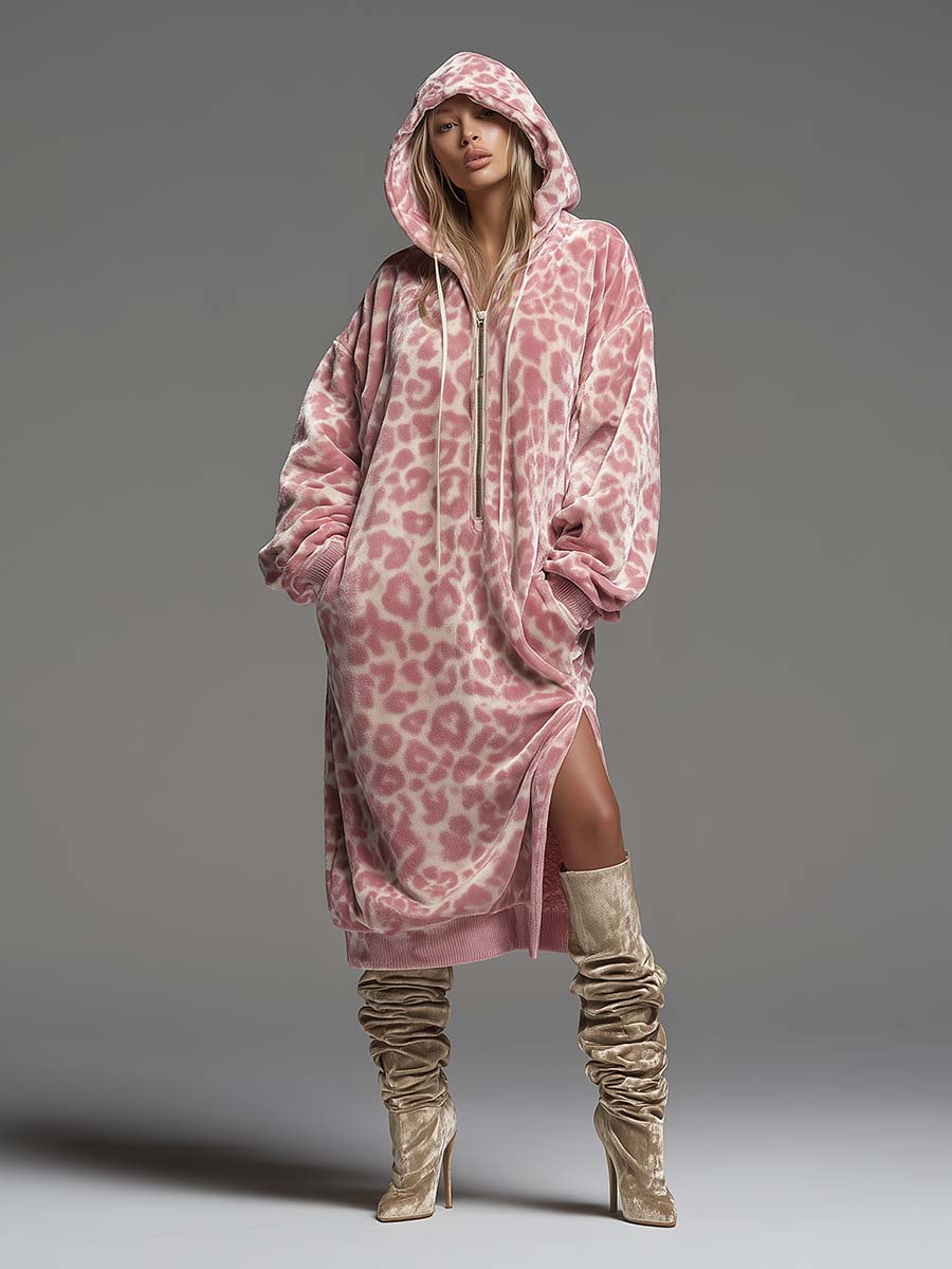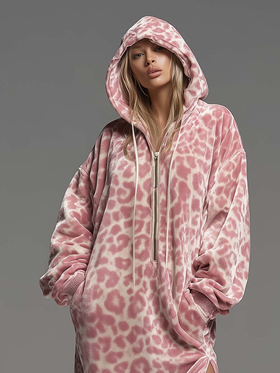 This retro-chic pink leopard print velvet maxi dress is both stylish and cool. It features a loose fit, a zipper for easy on and off, and a hood for a cool touch. The pink leopard print is fresh and modern. The overall look is casual and unique, brimming with retro streetwear flair.