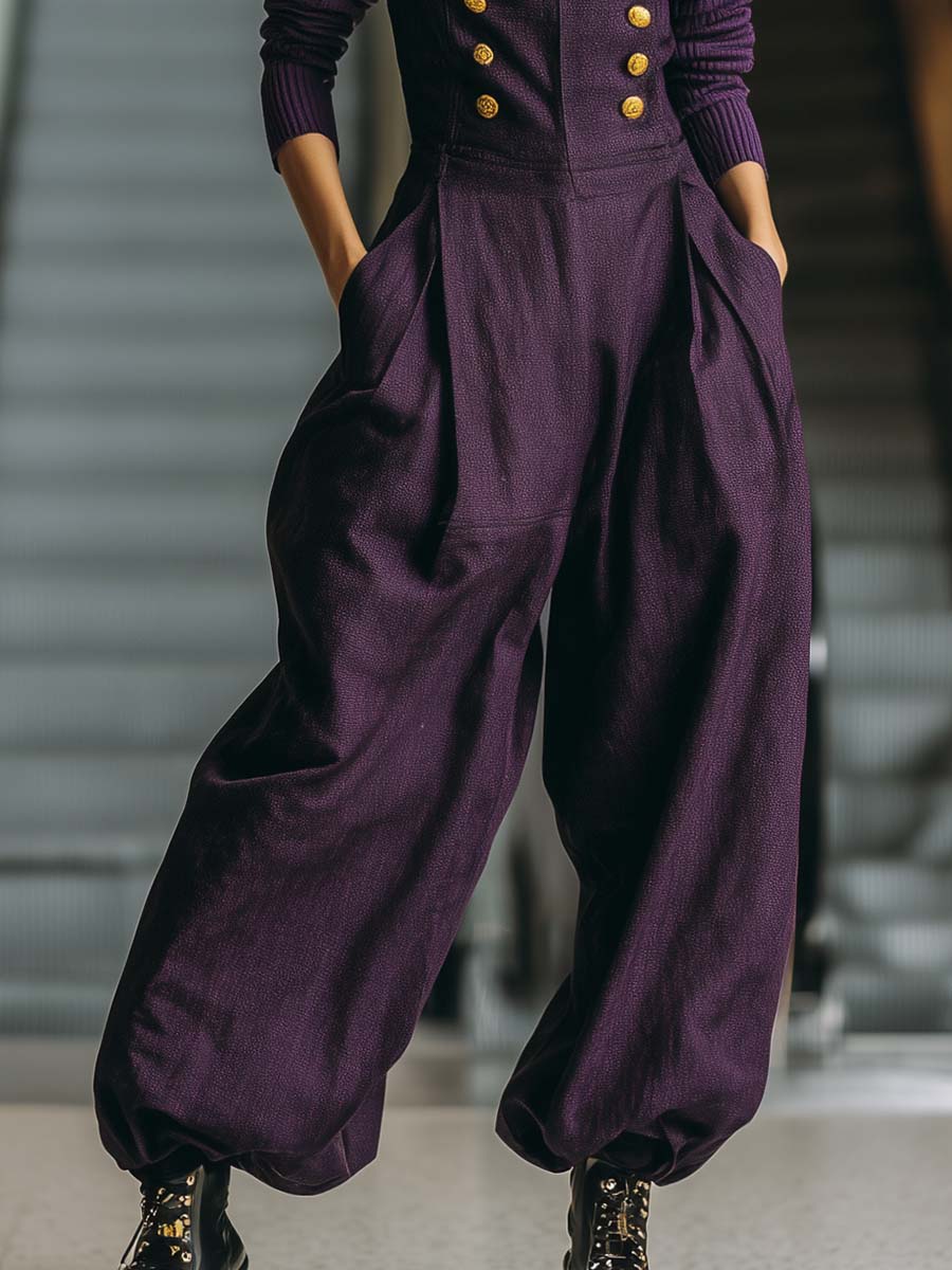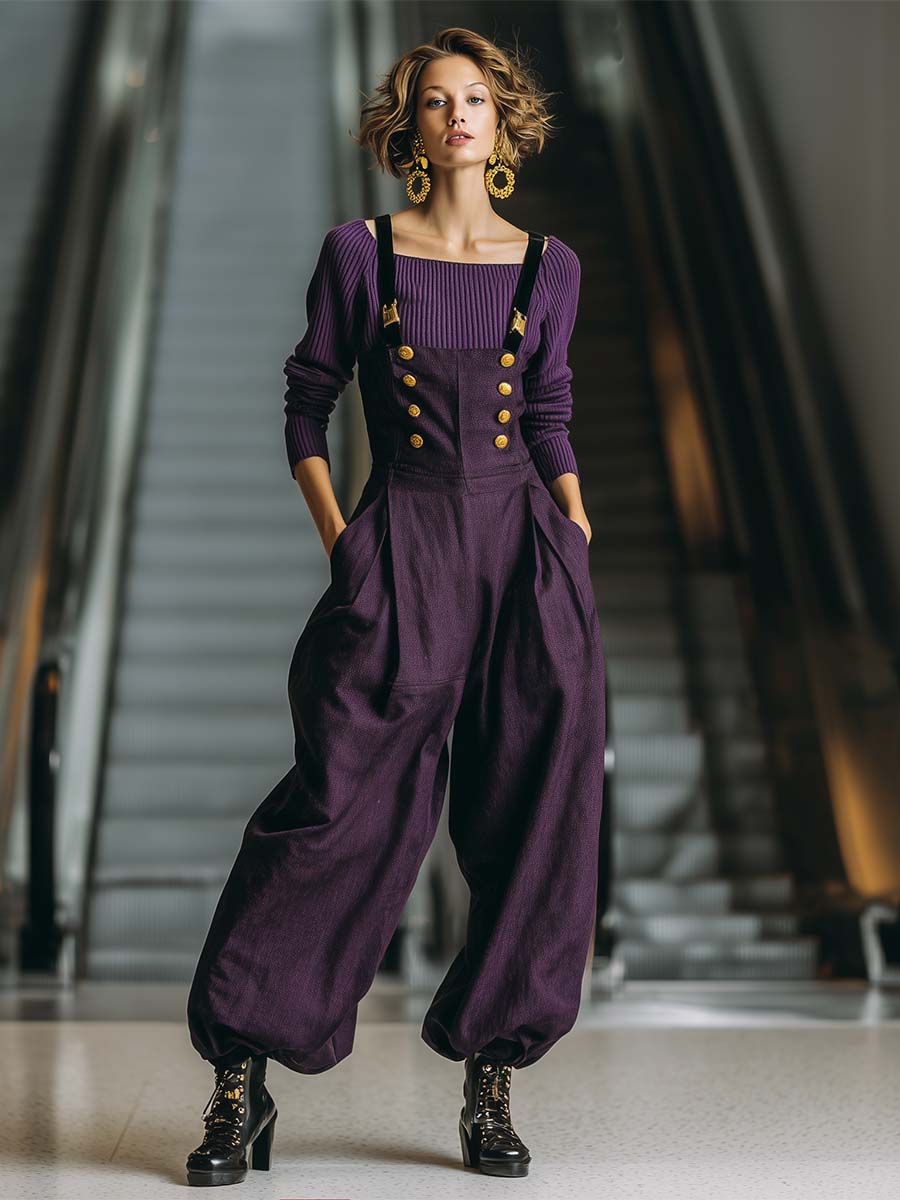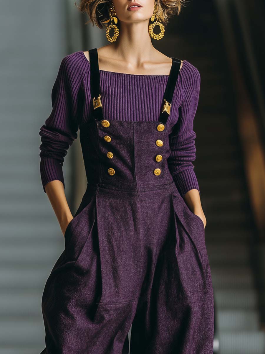 This Retro Urban Dark Purple Knitted Straight Collar Top and Cotton Metal Button Decorated Overalls Set is a unique ensemble that combines vintage charm with modern urban flair. The dark purple top is crafted from a soft knitted fabric, featuring a classic straight collar that adds a touch of elegance. Paired with overalls made from durable cotton, the outfit is completed with distinctive metal button decorations that add a hint of industrial chic.