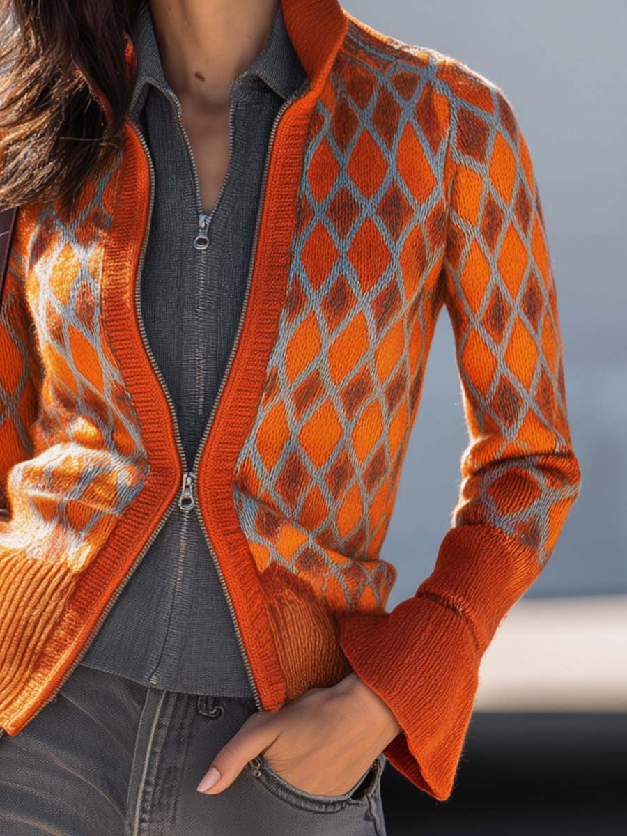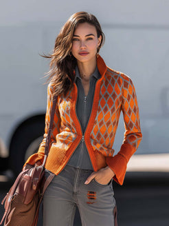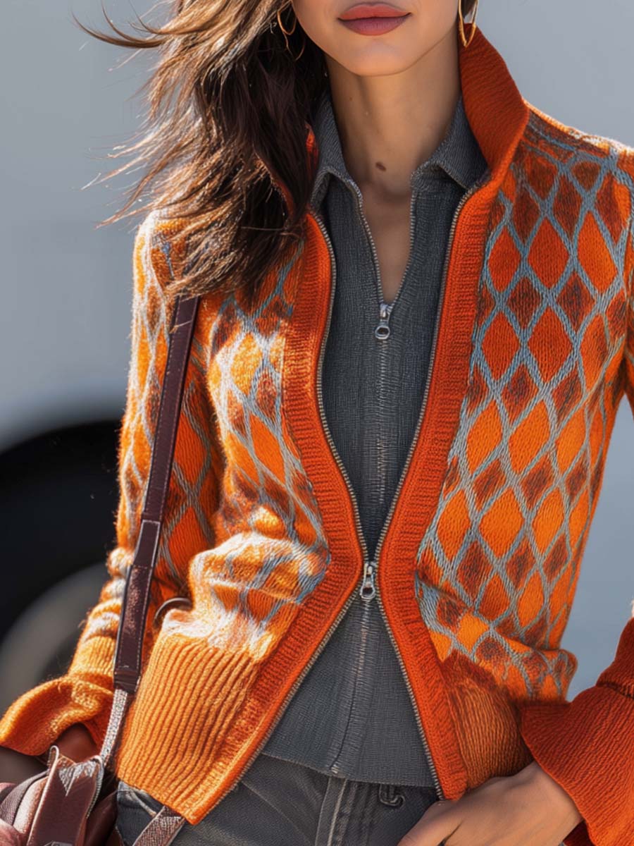 The Retro Versatile Lapel Front Zipper Orange Diamond Check Knitted Cardigan is a unique and stylish addition to any wardrobe. Crafted with precision, this cardigan features an eye-catching orange diamond check pattern that pays homage to retro fashion while maintaining a modern flair. The soft, knitted fabric ensures a comfortable fit, making it an ideal choice for both casual and semi-formal occasions.