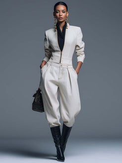 This White Denim Short Jacket exudes simplicity and versatility. Designed with a stand-up collar and a practical front zipper, it offers a modern twist to a classic denim piece. The crisp white color adds a refreshing touch to any outfit, making it an essential addition to your wardrobe.
