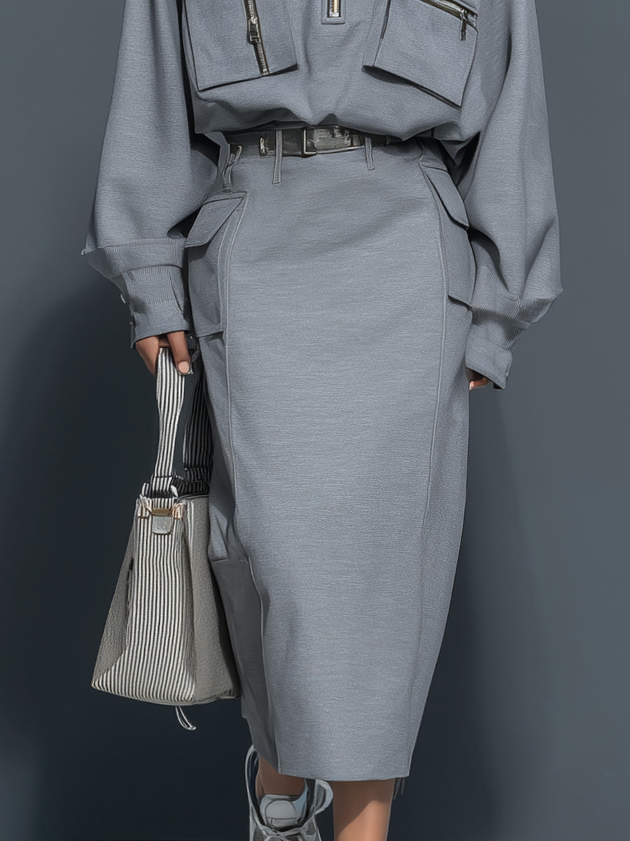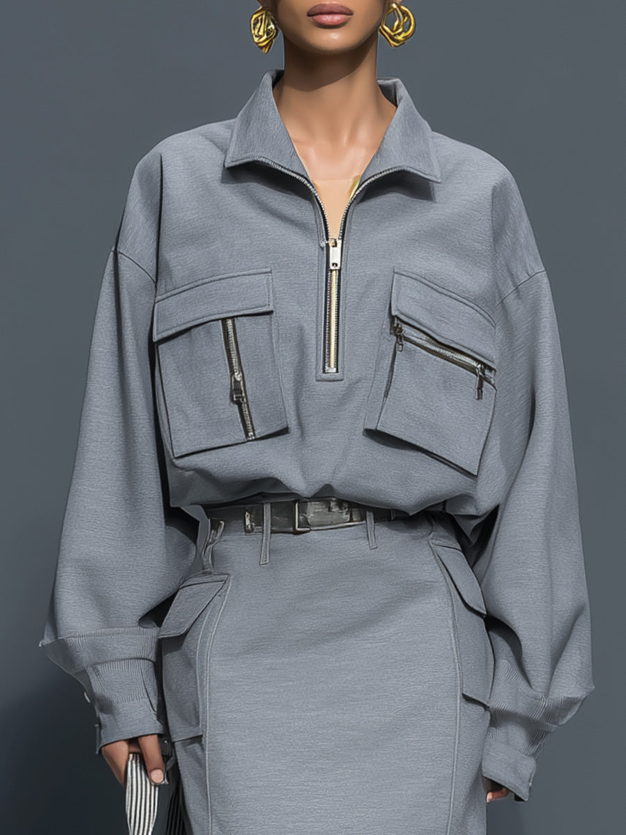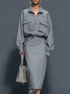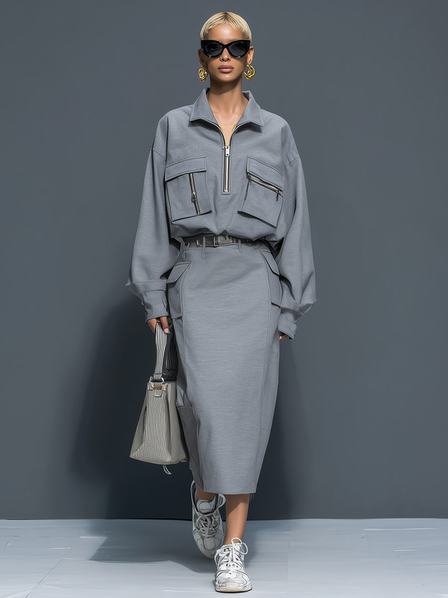 The Sophisticated Casual Grey Sport Cotton Lapel Front Zipper Cargo Pocket Pullover And Skirt Set is a chic ensemble that combines comfort with stylish practicality. Made from high-quality cotton fabric, this set features a uniquely designed pullover with a front zipper and a lapel collar, paired with a matching skirt. The ensemble is crafted in a neutral grey color, offering versatility and sophistication.