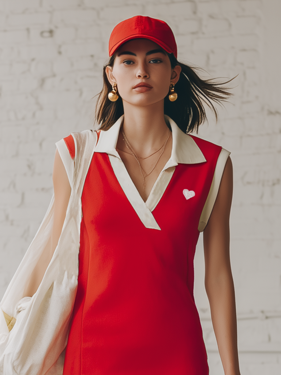 This vibrant red mini dress is a head-turner with its sporty yet stylish design. Made from comfortable knitted fabric, it features a flattering V-neckline and short sleeves, making it ideal for casual outings and athletic activities.