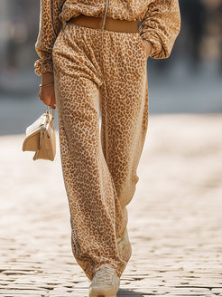 The sporty retro leopard print hoodie and pants set is a vibrant and playful ensemble that combines a classic athletic style with bold animal prints, making it a standout choice for casual outings or relaxed days at home. The hoodie features a comfortable fit with a drawstring hood and often includes retro-inspired design elements, like contrast stripes or color-blocking, which add to its vintage flair. The soft fabric ensures warmth and comfort, while the striking leopard print brings an edgy and fashionable twist. The matching pants typically have an elastic waistband and a tapered or wide-leg silhouette, providing a relaxed fit that pairs seamlessly with the hoodie.
