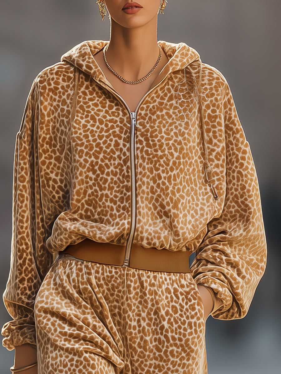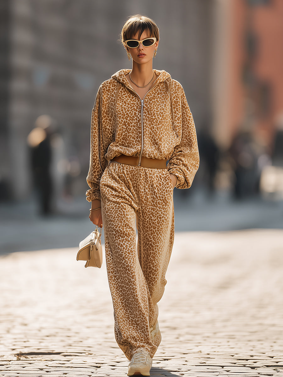 Styling this sporty set is all about balancing comfort with style. For a casual look, you can pair the hoodie and pants with classic white sneakers and a simple crossbody bag to keep the focus on the bold print. Layering with a bomber jacket or a denim jacket can add an extra layer of warmth and enhance the sporty vibe. If you want to dress it up a bit for a brunch or a casual outing, consider adding fashionable slides or chunky platform sneakers, along with fun accessories like oversized sunglasses or hoop earrings. This sporty retro leopard print hoodie and pants set is perfect for those who love to make a statement while enjoying the ultimate comfort and style.