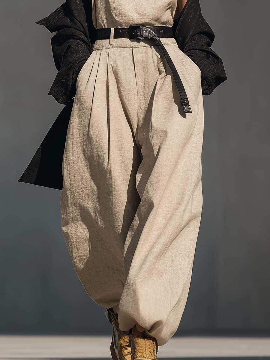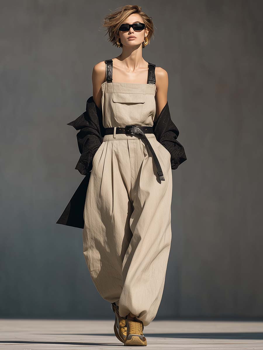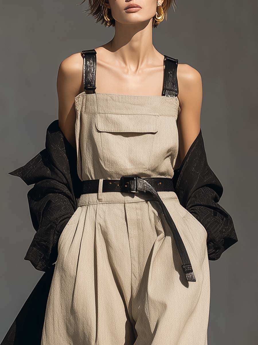 This stylish beige cotton and linen jumpsuit features a chic all-match black leather shoulder strap, perfect for making a bold fashion statement. The jumpsuit is designed with a workwear-inspired look, offering both comfort and a contemporary aesthetic.