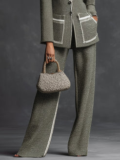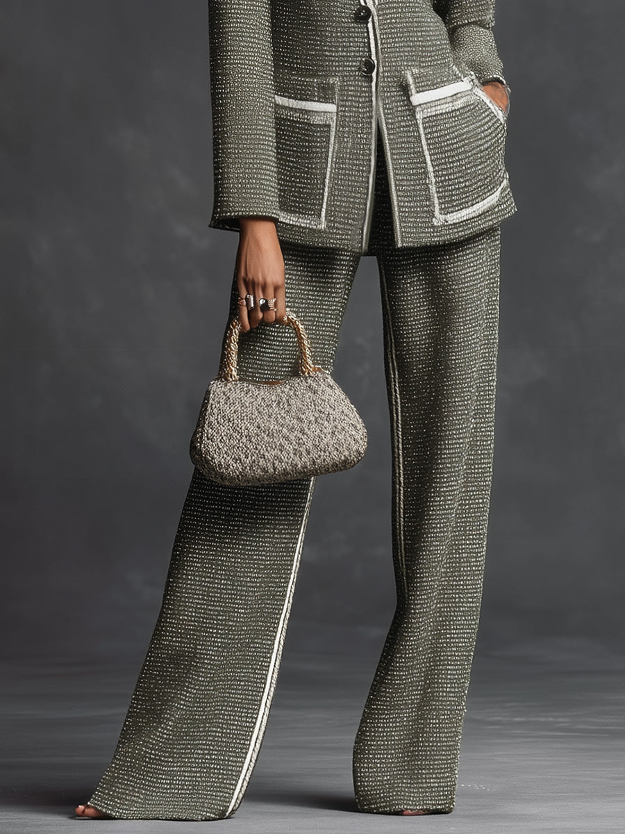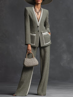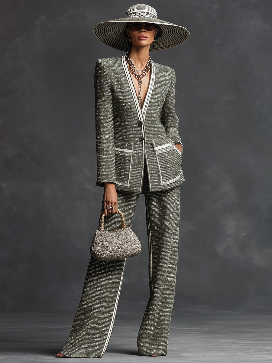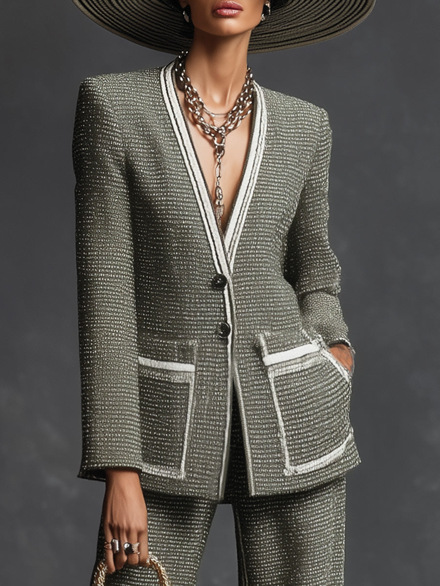 This Stylish and Neat Gray-green Tweed V-neck Jacket and Pants Set is a modern take on classic chic. Crafted from high-quality tweed, the set features a sophisticated gray-green hue that exudes elegance and versatility, suitable for various occasions from professional settings to casual outings.