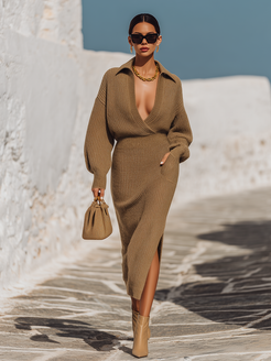 The stylish sexy lapel long-sleeved knitted dress is a contemporary piece that seamlessly blends comfort with a sophisticated edge, making it perfect for a variety of occasions. Crafted from a soft knitted fabric, this dress offers both warmth and flexibility, ideal for cooler weather or transitional seasons.The long sleeves and versatile length make it suitable for everything from casual daytime outings to more formal evening gatherings, ensuring it is both a stylish and practical addition to any wardrobe.