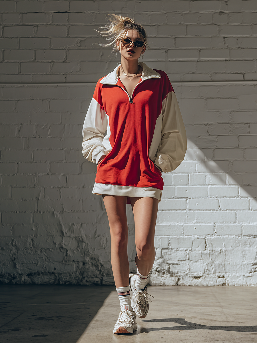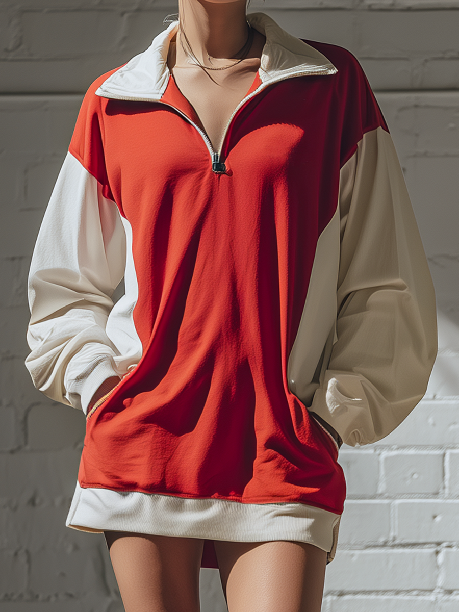 This Stylish Simple Loose-fitting Long-sleeved Lapel Collar Contrasting Colors Front Zipper Closure Cotton Mini Dress is ideal for those who value comfort mixed with a chic design. Whether you're heading to a casual outing or a semi-formal event, this dress promises to keep you stylish and comfortable.